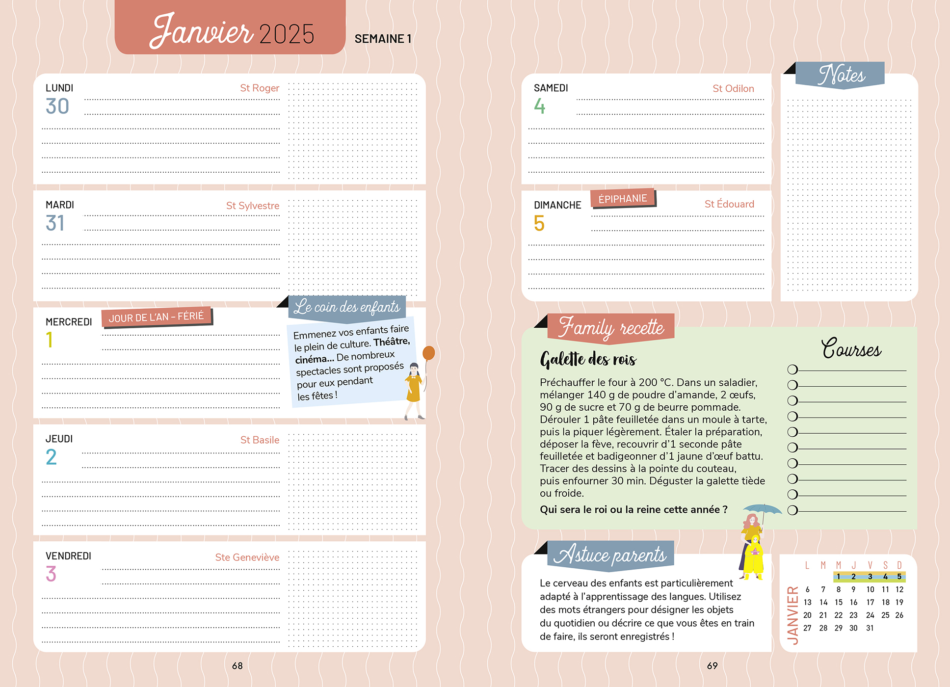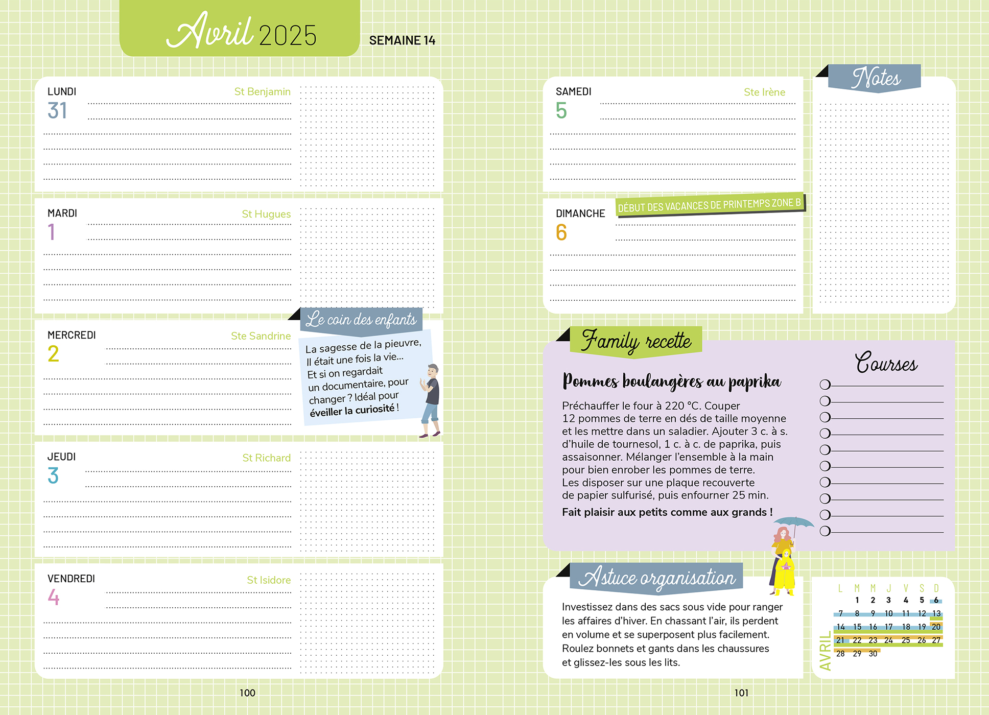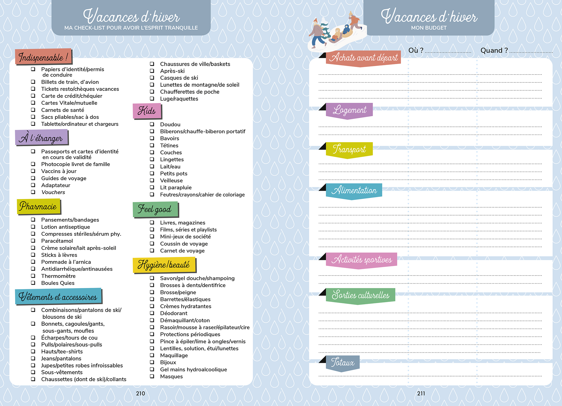 – Des pages ultra pratiques (contacts, emplois du temps, check-lists et budgets de vacances, etc.).