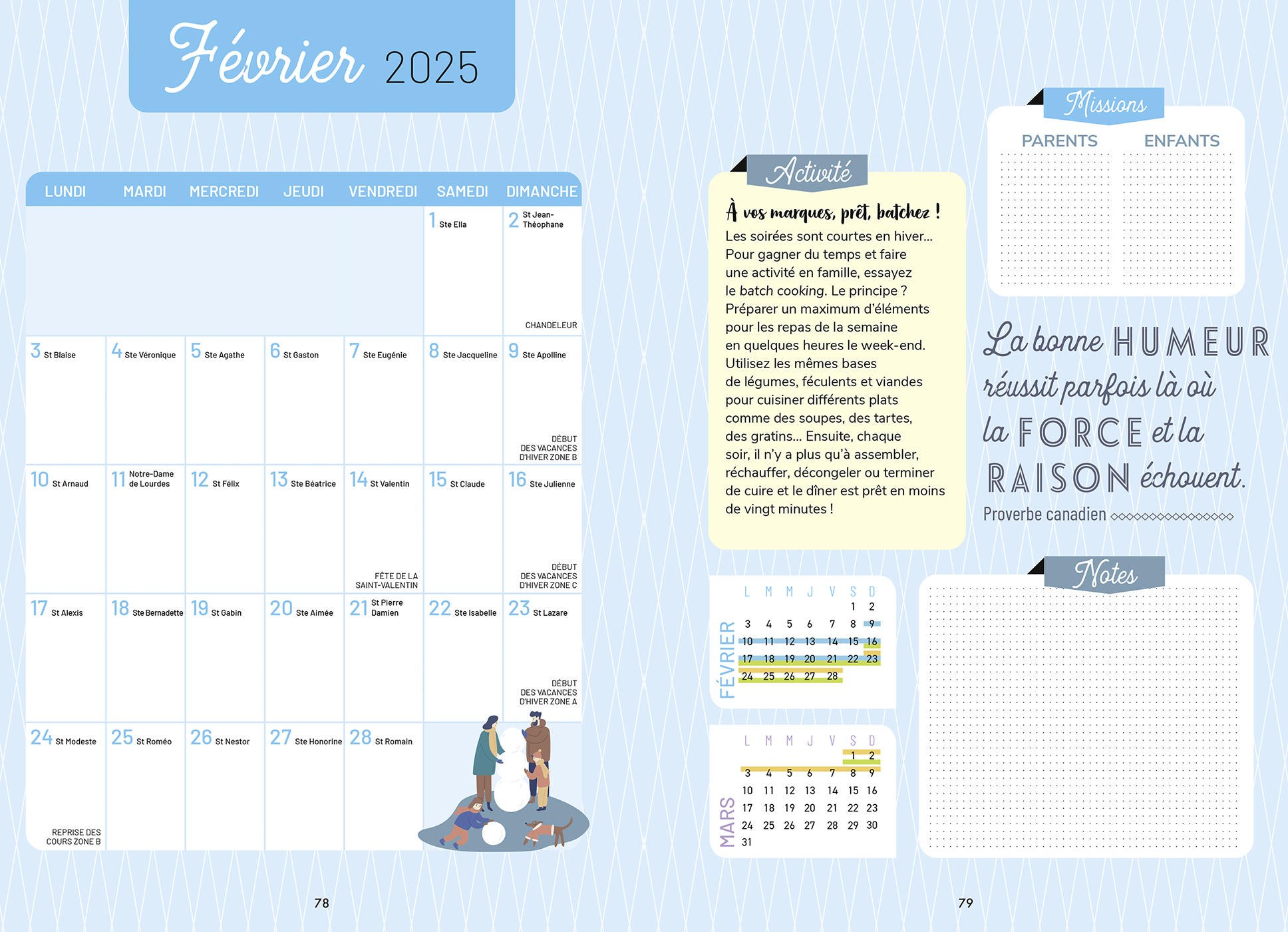 Retrouvez, chaque mois : un planning mensuel avec un espace dédié aux parents et un autre aux enfants, un emplacement pour noter les priorités du mois et une activité à faire en famille.