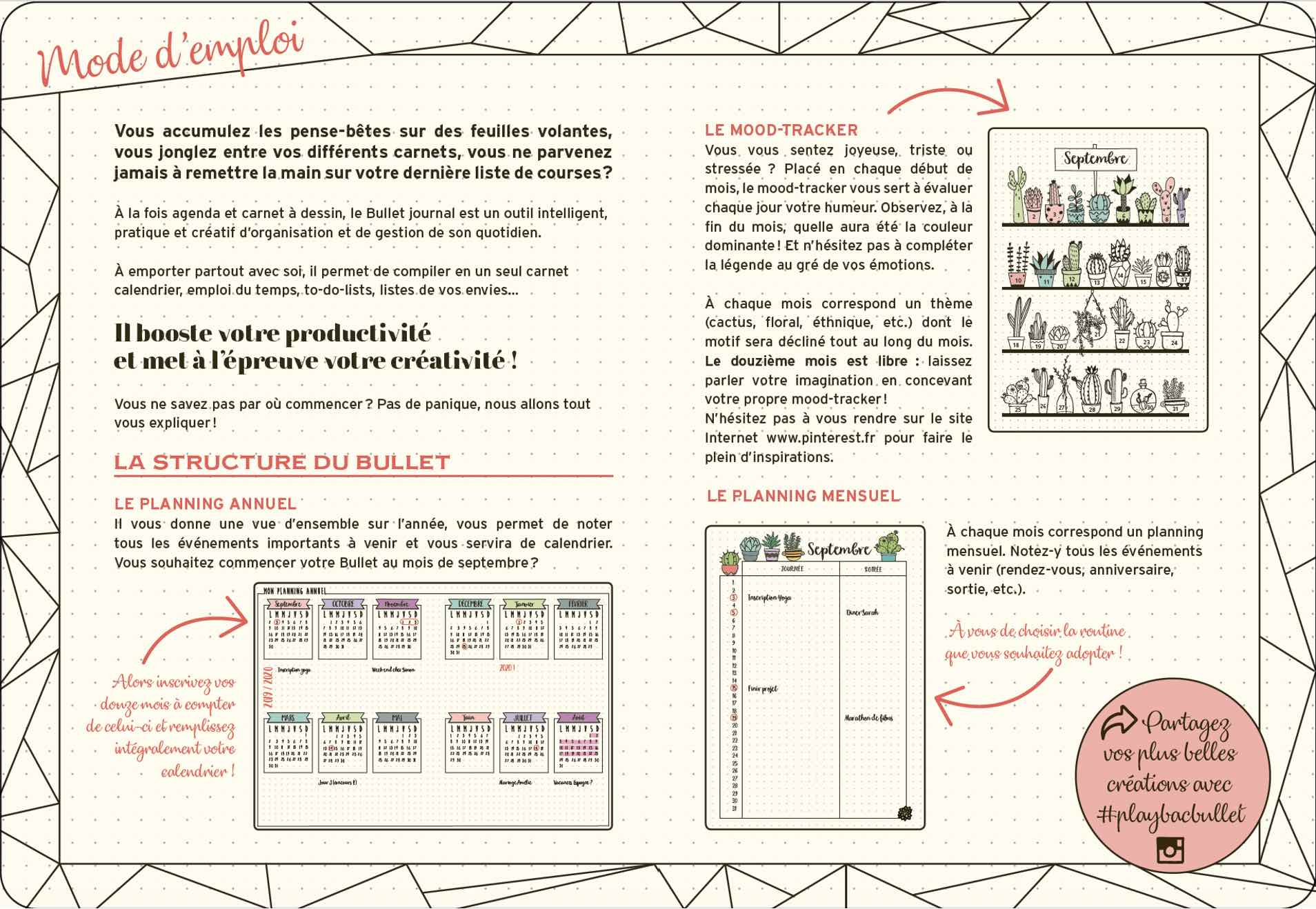 Créez sans stress l’agenda qui vous ressemble avec ce format bullet ! Des pages de modèle et de nombreux conseils, des trackers thématiques à remplir librement (mes livres à lire, mes prochaines vacances…), des espaces libres pour créer ses plannings, ses suivis de tâches et d’objectifs, etc. Un agenda à réaliser à son image et facilement grâce à un contenu progressif : la personnalisation et la création s’intensifient petit à petit au fur et à mesure de l’année ! 224 pages au papier soigné, fermeture avec élastique, signet et pochette à soufflet pour conserver ses petits et grands papiers du quotidien.