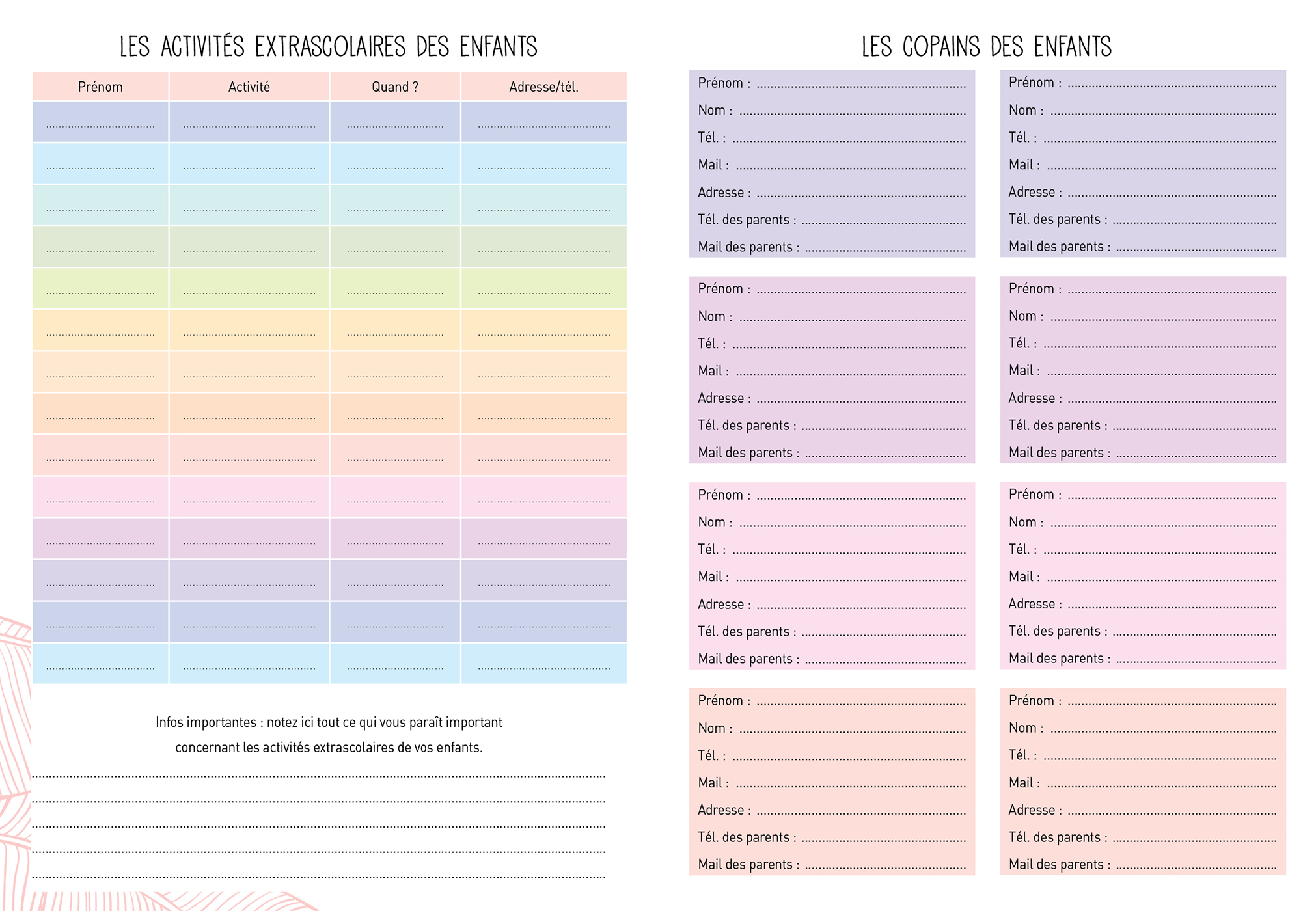 – Numéros utiles (famille, numéros d'urgence, médécins, copains des enfants…)