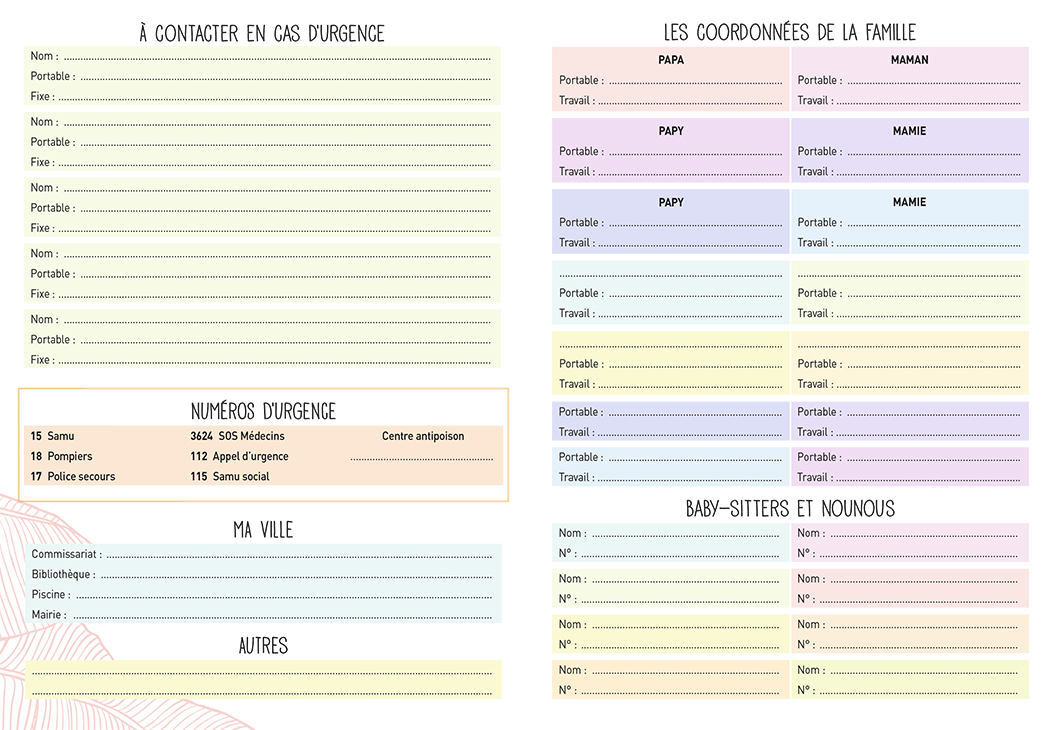 – Numéros utiles (famille, numéros d'urgence, médécins, copains des enfants…)