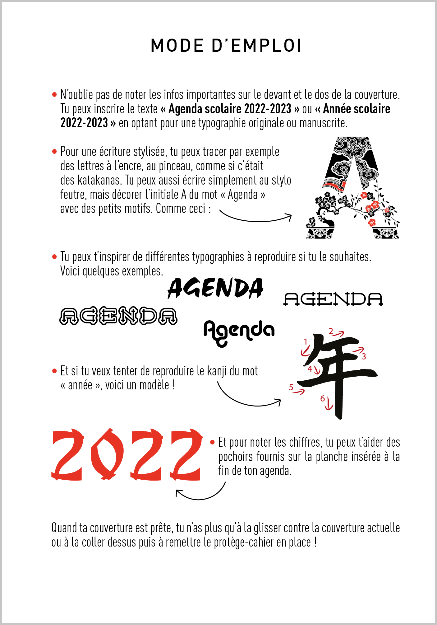 – Une couverture plastifiée pour y glisser la création de ton choix.