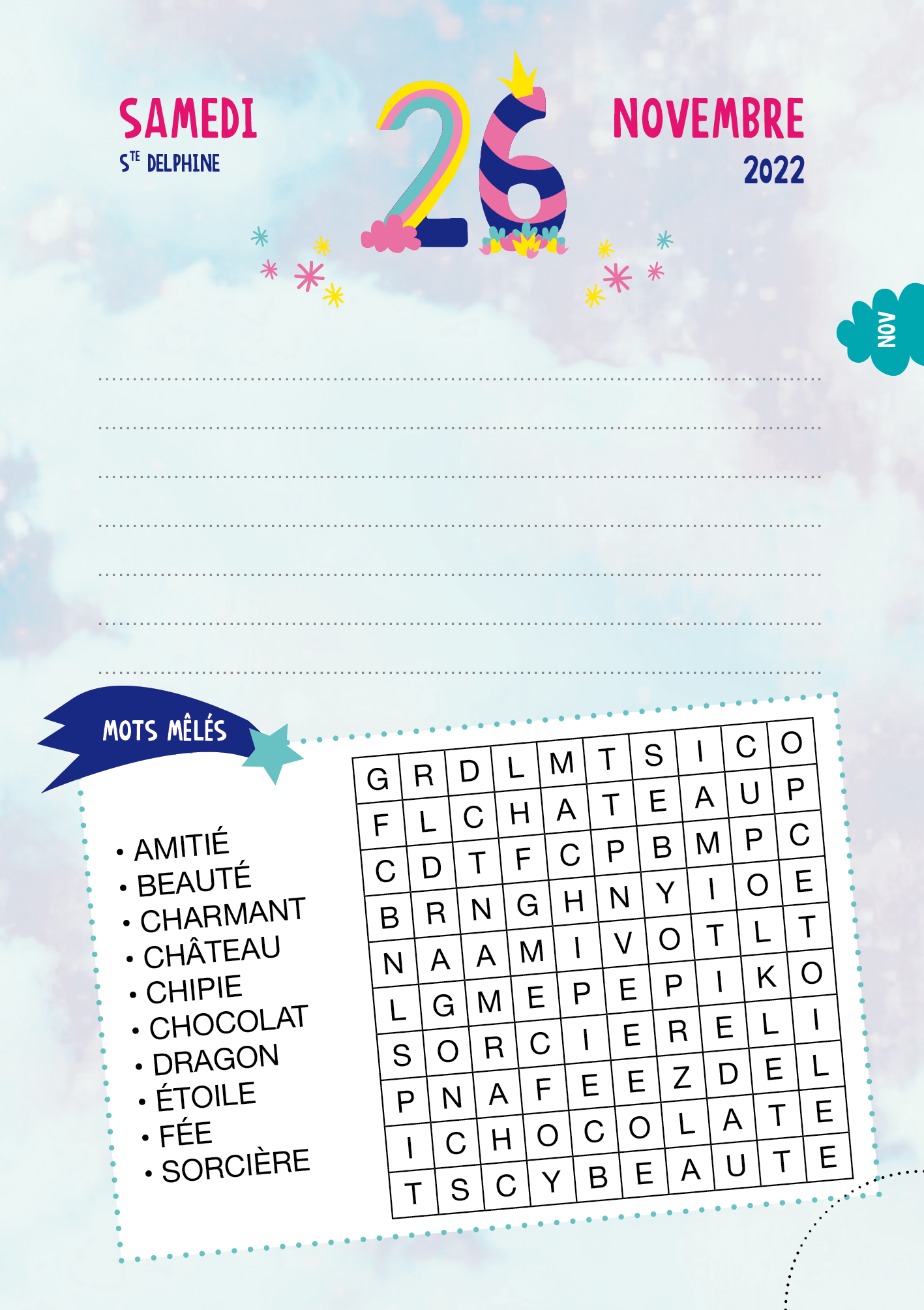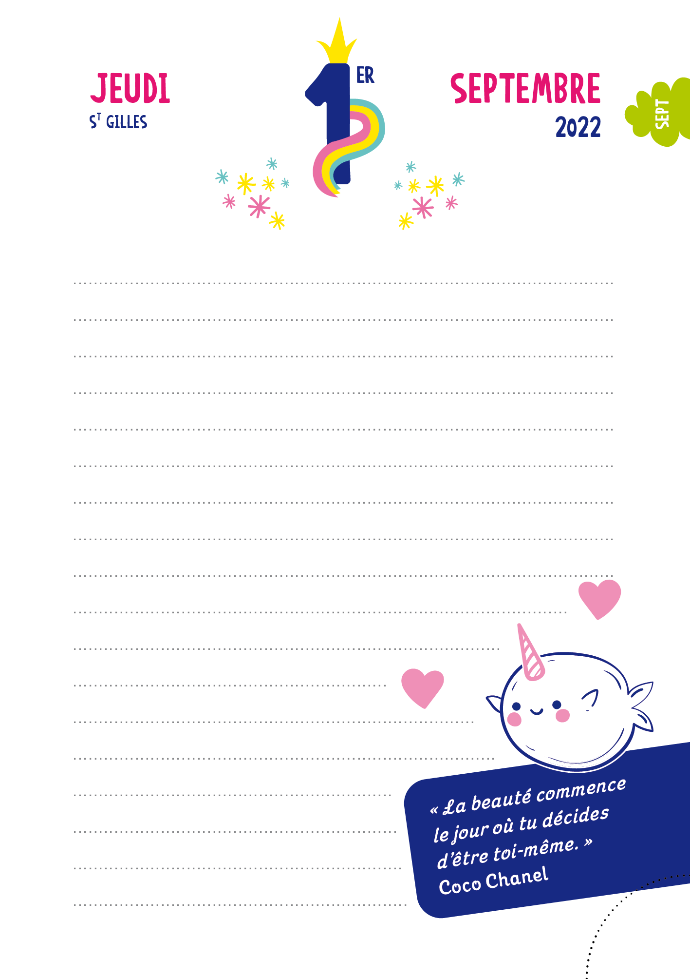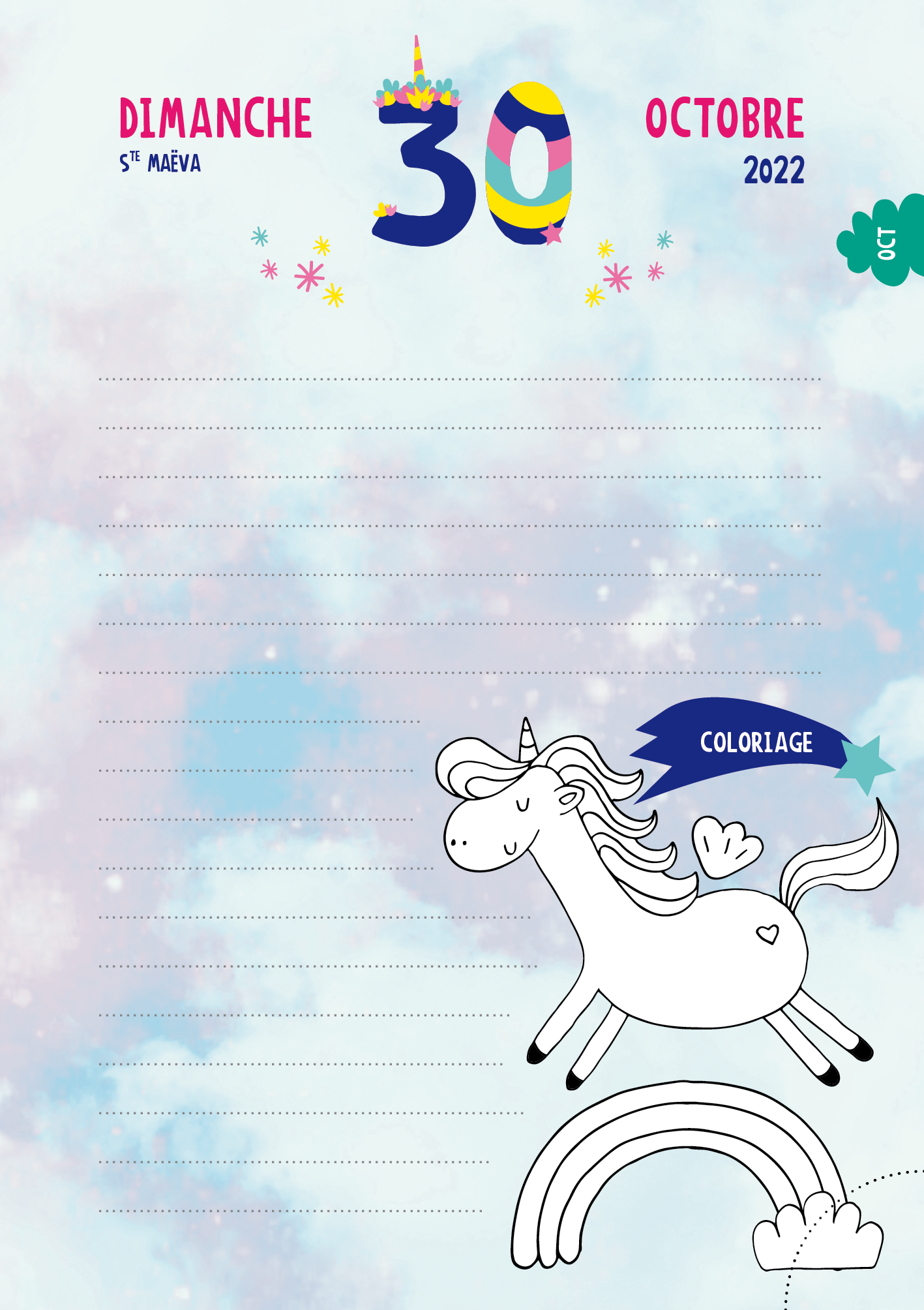 Un joli agenda avec une page par jour pour noter tes devoirs et une surprise à découvrir par jour : une citation, une illustration, un coloriage, une recette ou un DIY…