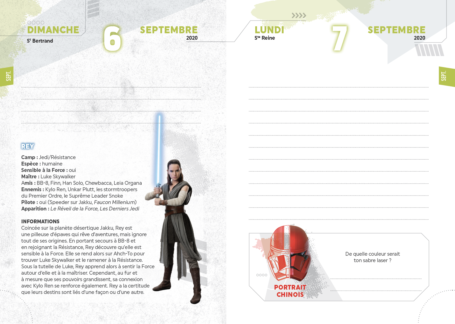 Que la force t’accompagne durant toute l’année scolaire ! Un joli agenda avec une page par jour pour noter tes devoirs et des surprises à découvrir tout au long de l’année : citations, illustrations, jeux, tests… Et aussi toutes les pages indispensables : – 1 emploi du temps ; – 1 calendrier ; – 1 répertoire pour pouvoir toujours joindre tes copines ; – 1 page copines et 1 page copains ; – des cartes de géographie. En bonus : un marque-page.