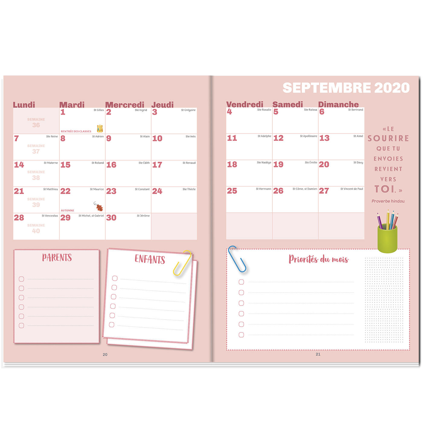 Un agenda ultra-simple pour s’organiser en famille sans chichis de septembre 2021 à décembre 2022 : – Une entrée mensuelle épurée avec un espace dédié aux parents et un autre aux enfants, un emplacement pour noter les priorités du mois et une citation inspirante. – Des semainiers hebdomadaires aérés et clairs avec un espace de notes pour tous les jours de la semaine, une vision du mois en cours, une recette pour la semaine et une liste de courses à remplir. – 230 stickers pratiques et variés accessibles à toute la famille ! – Un rabat au début de l’agenda pour y glisser des papiers ou à utiliser comme marque-page.