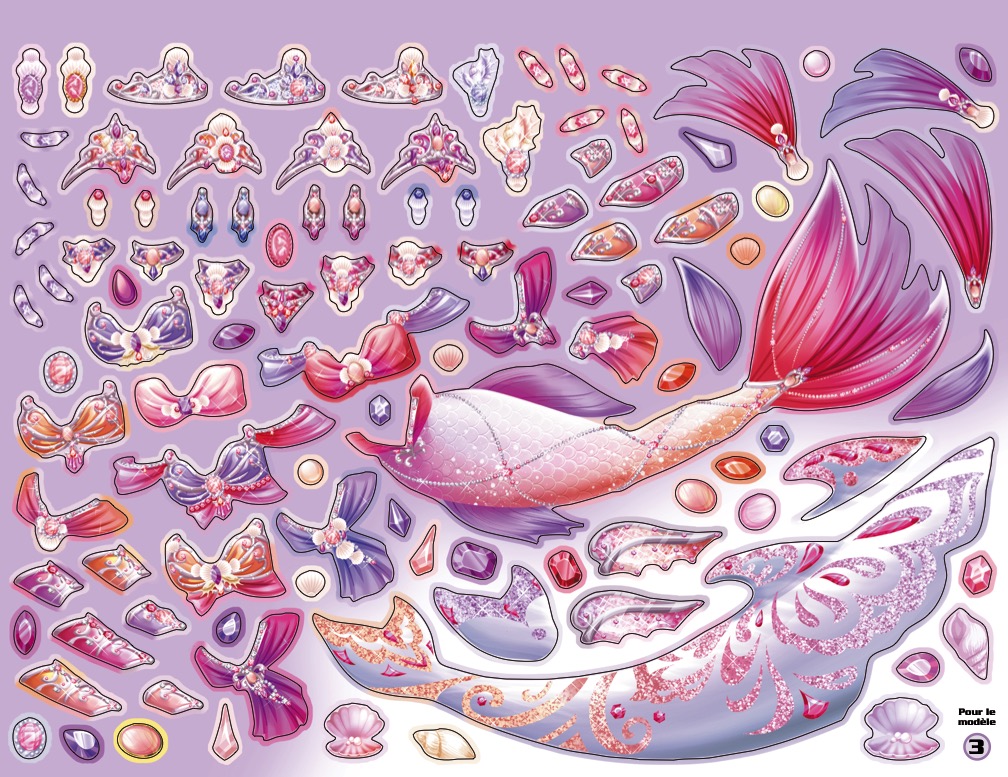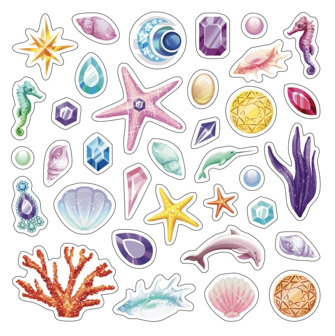 Découvre le monde merveilleux des sirènes et leurs amis dauphins ! Orne-les de somptueux bijoux ! Ce carnet contient : – 553 stickers dont 53 brillants ; – 5 modèles pour t’inspirer ; – 4 planches de motifs à découper ; – 32 pochoirs ; – 40 duos de sirènes et dauphins à dessiner, colorier et « sticker ». En cadeau : 35 autocollants en relief effet bijoux !