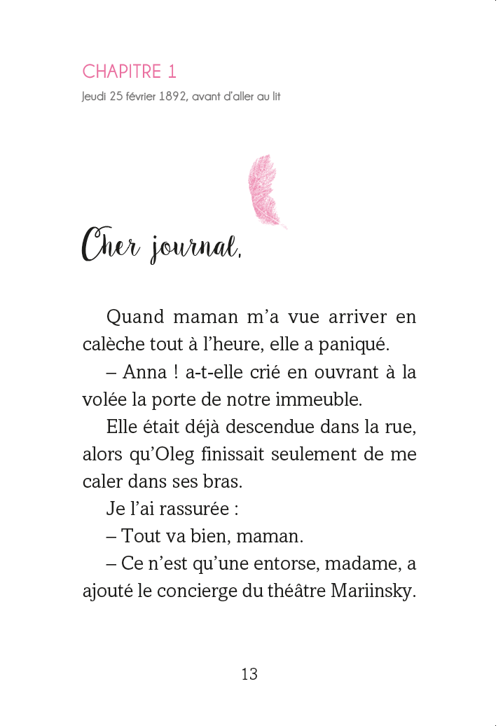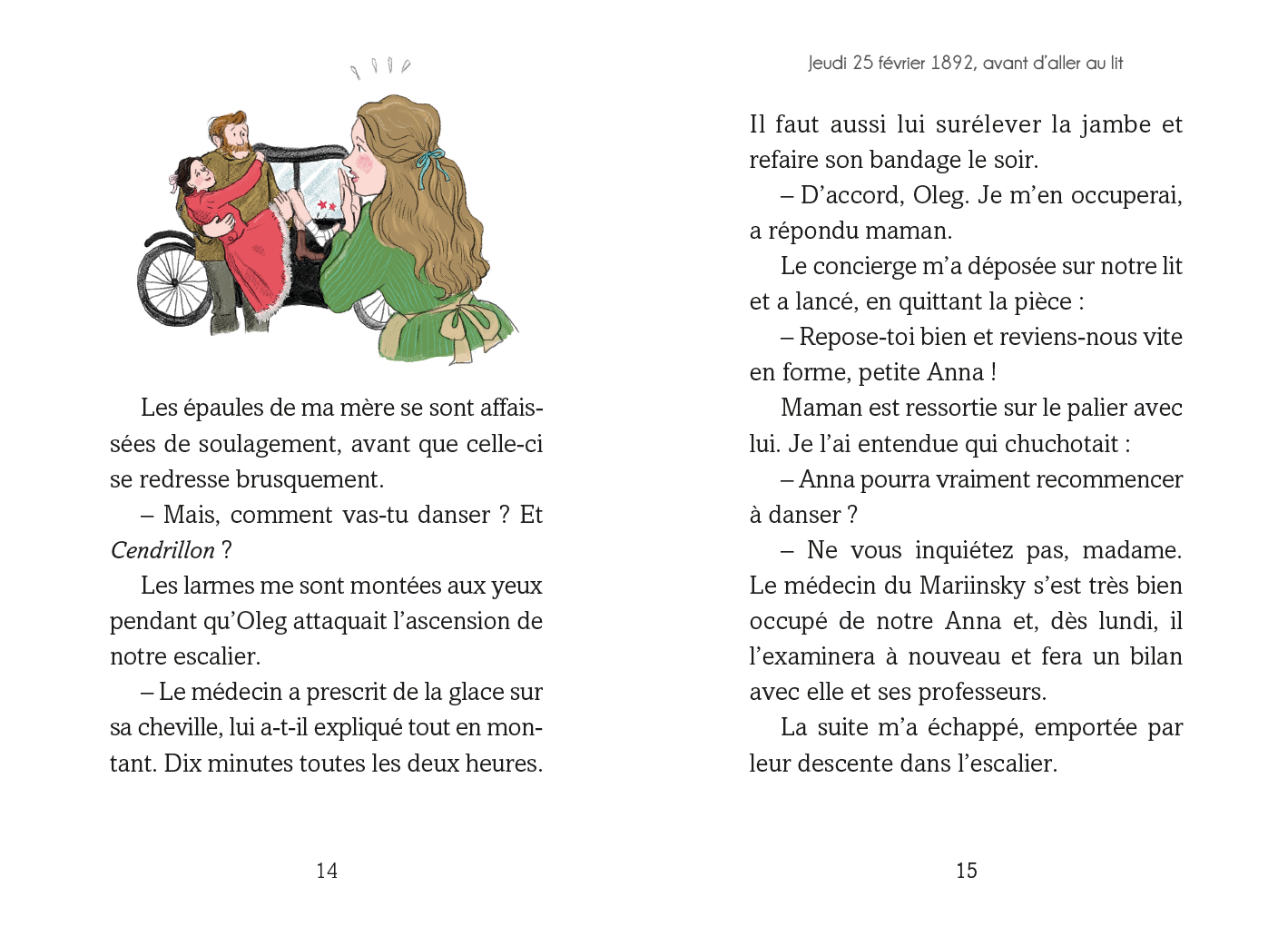Plonge dans le journal palpitant d’Anna Pavlova, la plus célèbre ballerine de tous les temps ! Dimanche 28 février 1892 Cher journal, Jeudi, je me suis foulé la cheville, et j’ai interdiction de danser ! Le médecin du Mariinsky doit bientôt me réexaminer, et je tremble déjà d’entendre ce qu’il va m’annoncer. Cendrillon ou pas Cendrillon ? Pourrai-je remonter sur scène avec mon amie Galina pour la chorégraphie des petites souris ? Verdict demain matin.
