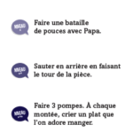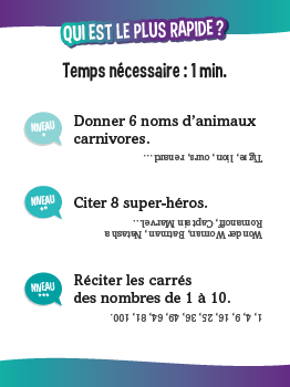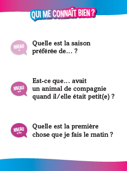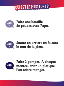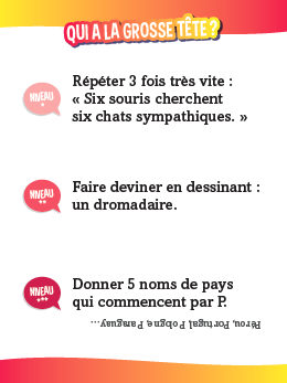 Maman, papa, Anaïs ou Hugo ? Défiez-vous enfants contre parents avec des quiz délirants ! 510 quiz avec : • des questions super marrantes ; • des défis physiques parfois acrobatiques ; • des mimes, des devinettes, des charades… avec des questions adaptées à chaque niveau, facile (CP-CE1-CE2), moyen (CM1-CM2-6e) et difficile (adultes).