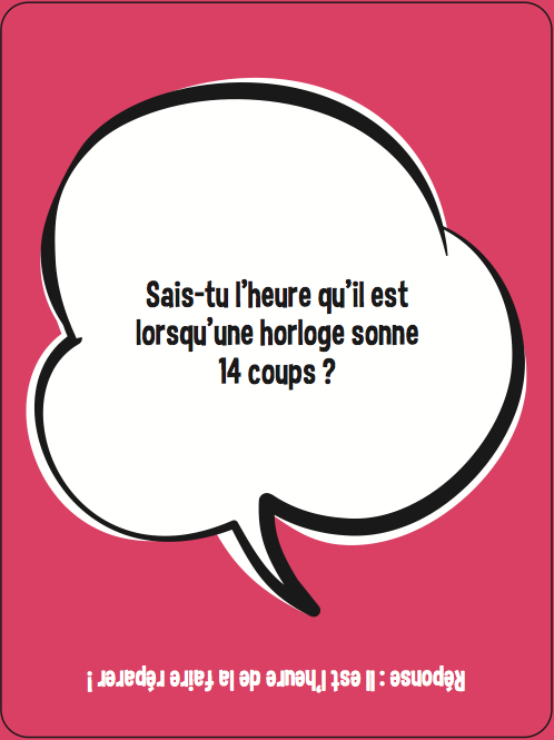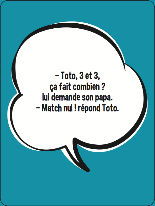 Un max de blagues pour faire pipi dans sa culotte ! Des blagues de Toto, des « Monsieur et Madame », des devinettes… Pour être la star de la récré ou faire hurler de rire ses parents ! Cartes blagues à piocher à volonté.
