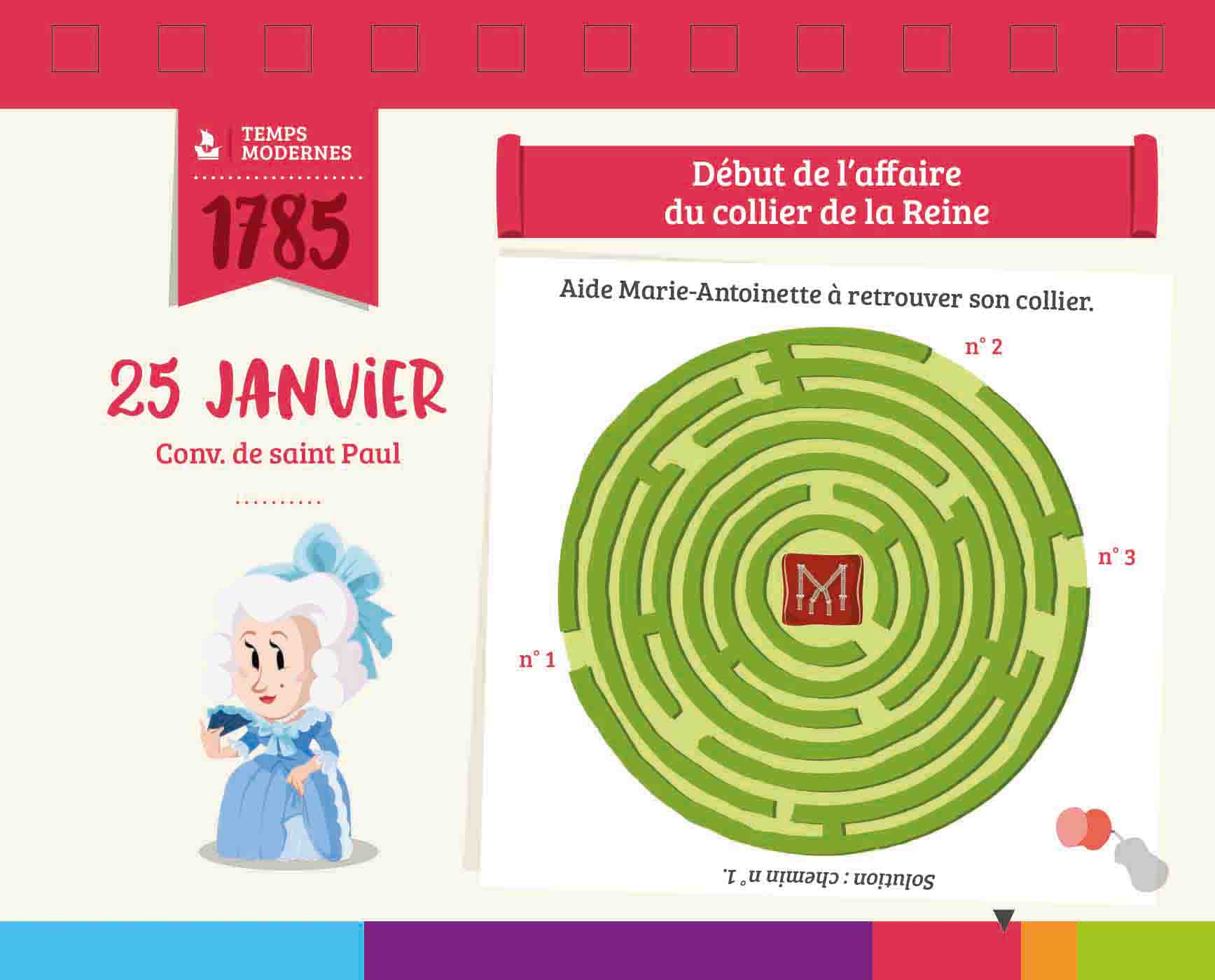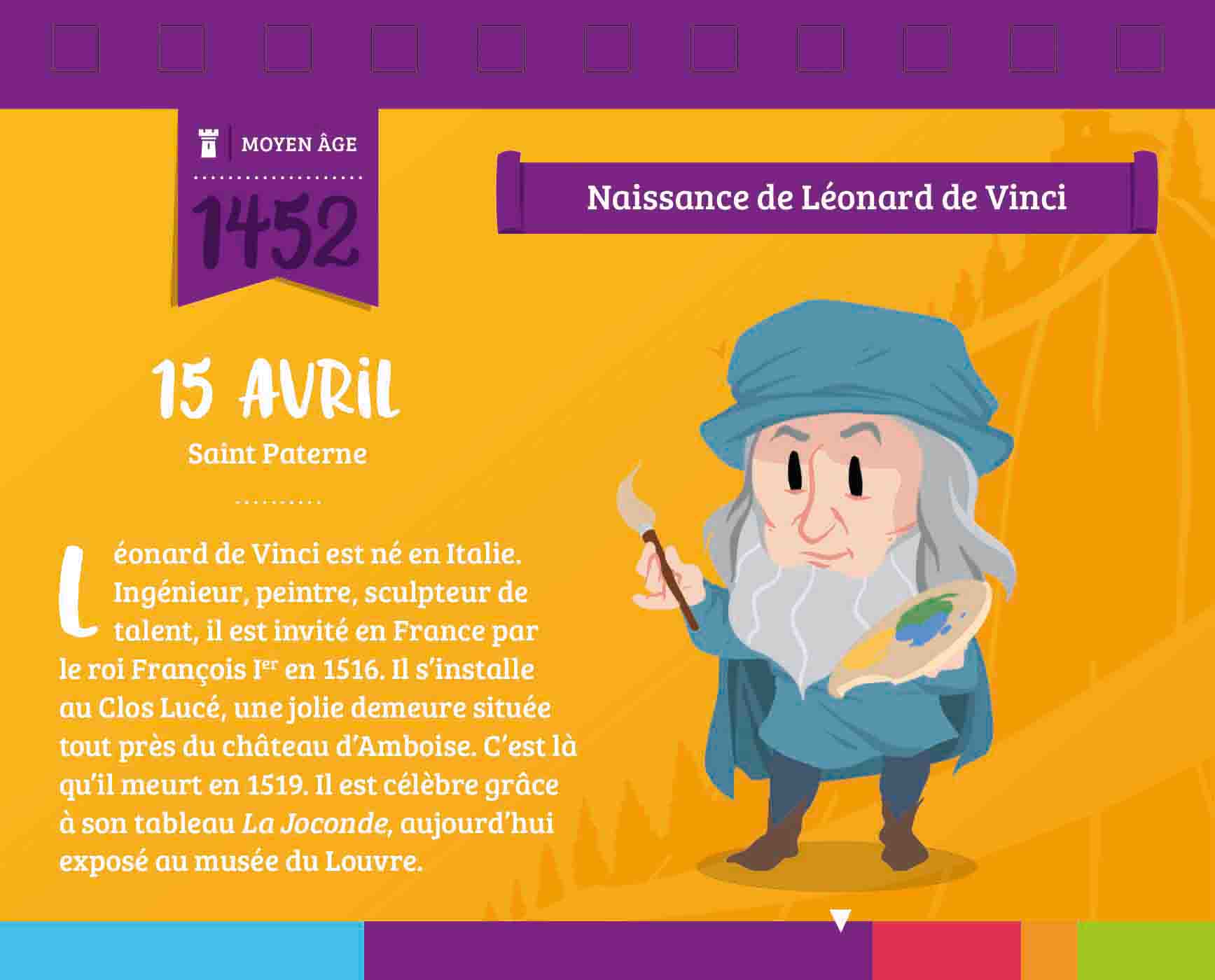 Pas un jour sans la naissance d’un roi, une invention scientifique, une victoire militaire, un mariage princier ou un traité de paix que tu découvriras à travers un court texte illustré et des jeux. Remonte le temps avec ce calendrier !