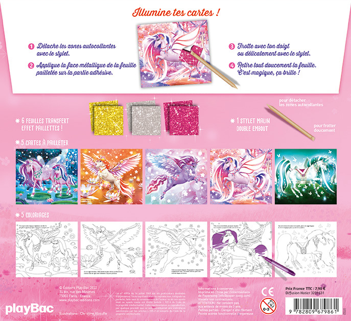 Illumine tes cartes ! 1 – Détache les zones autocollantes avec le stylet. 2 – Applique la face métallique de la feuille pailletée sur la partie adhésive. 3 – Frotte avec ton doigt ou délicatement avec le stylet. 4 – Retire tout doucement la feuille. C’est magique, ça brille ! Contient : – 6 feuilles transfert effet paillettes ! – 5 cartes à pailleter – 5 coloriages – 1 stylet malin à double embout : pour détacher les zones autocollantes et pour frotter doucement