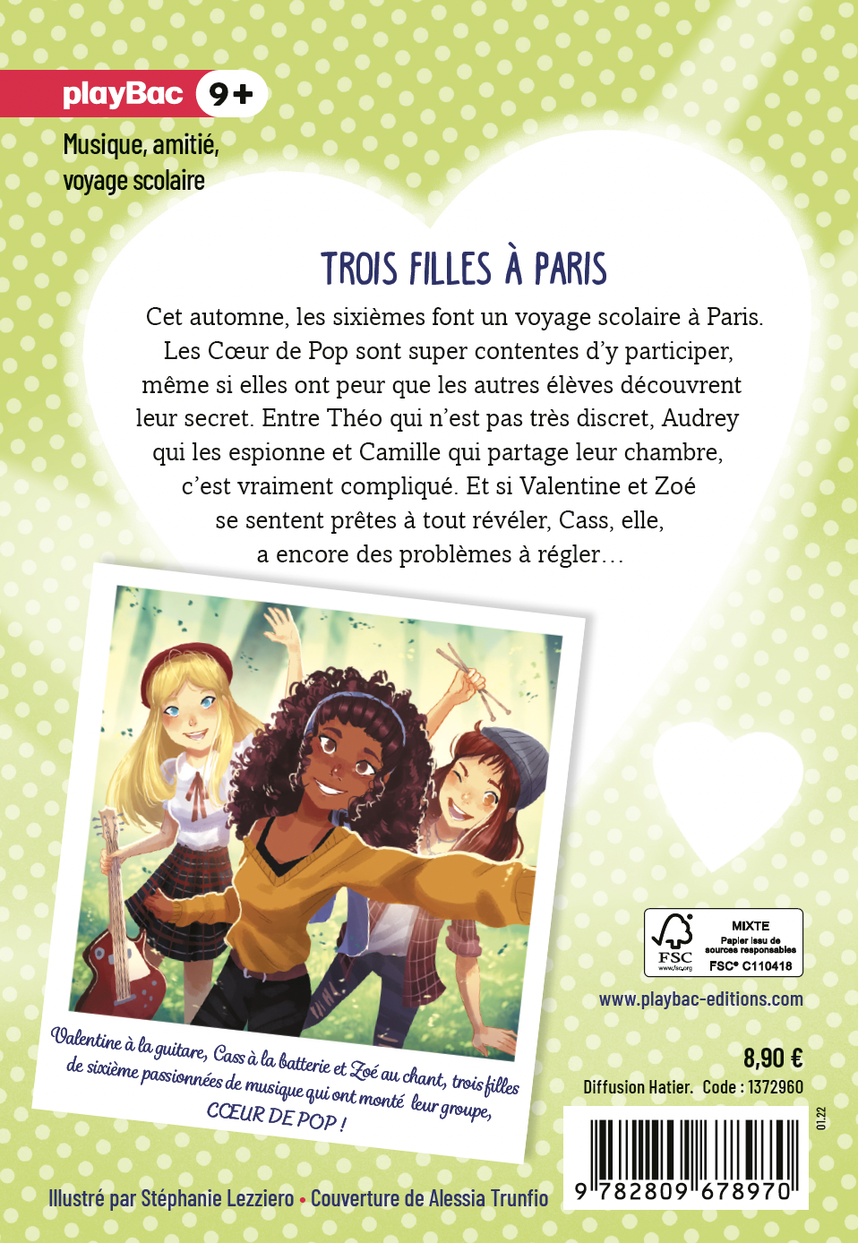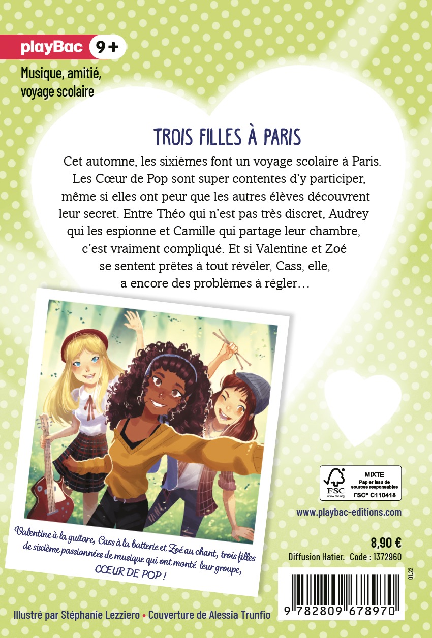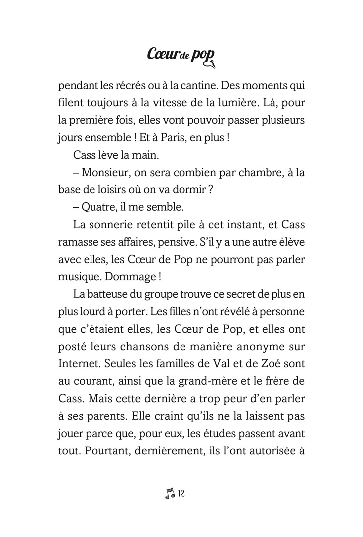 Passion musique : quand le rêve de 3 amies devient réalité !  Cet automne, les 6e font un voyage scolaire à Paris. Les Coeur de Pop sont super contentes d’y participer, même si elles ont peur que les autres élèves découvrent leur secret. Entre Théo qui n’est pas très discret, Audrey qui les espionne et Camille qui partage leur chambre, c’est vraiment compliqué. Et si Valentine et Zoé se sentent prêtes à tout révéler, Cass, elle, a encore des problèmes à régler… En bonus : des tutos, infos et quiz sur les chanteurs.
