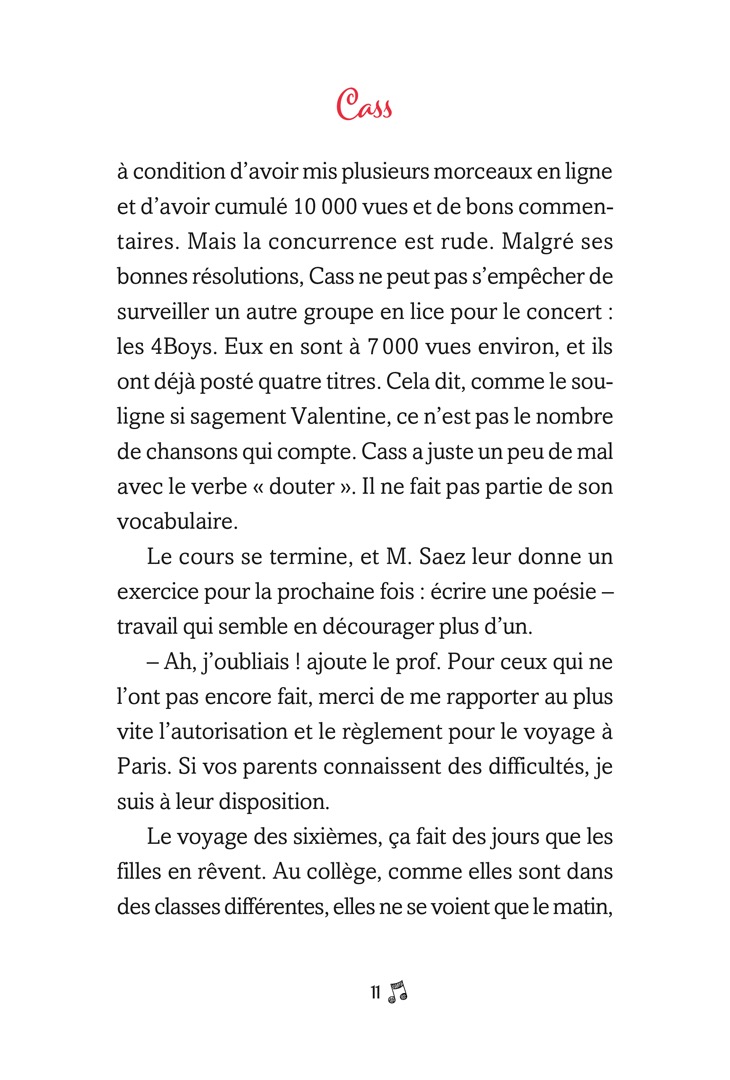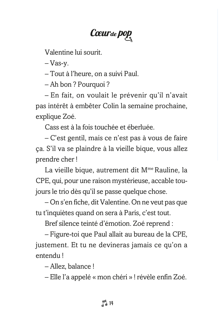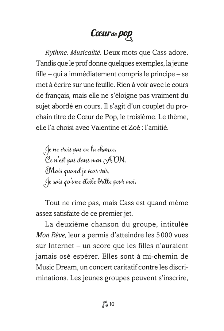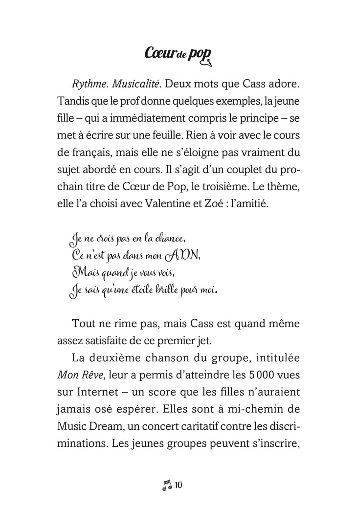 Passion musique : quand le rêve de 3 amies devient réalité !  Cet automne, les 6e font un voyage scolaire à Paris. Les Coeur de Pop sont super contentes d’y participer, même si elles ont peur que les autres élèves découvrent leur secret. Entre Théo qui n’est pas très discret, Audrey qui les espionne et Camille qui partage leur chambre, c’est vraiment compliqué. Et si Valentine et Zoé se sentent prêtes à tout révéler, Cass, elle, a encore des problèmes à régler… En bonus : des tutos, infos et quiz sur les chanteurs.