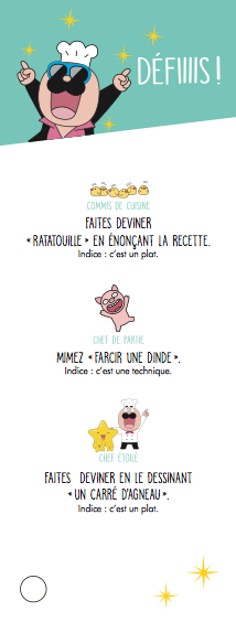 Un apéro déjanté avec Chefclub ! Quelques recettes d’apéro et des quiz et défis plus drôles les uns que les autres, voici le coffret idéal pour passer une soirée de folie entre amis ! Grâce au premier éventail : à vous les recettes bluffantes et gourmandes et les cocktails détonants. Et avec le second éventail, défiez vos amis ! Garder l’équilibre sur un pied assez longtemps pour citer les ingrédients de la croziflette, dessiner un appareil à raclette dans le dos d’un joueur pour lui faire deviner ou encore mimer « manger des moules », qui sera le plus fort ? À offrir ou à s’offrir.