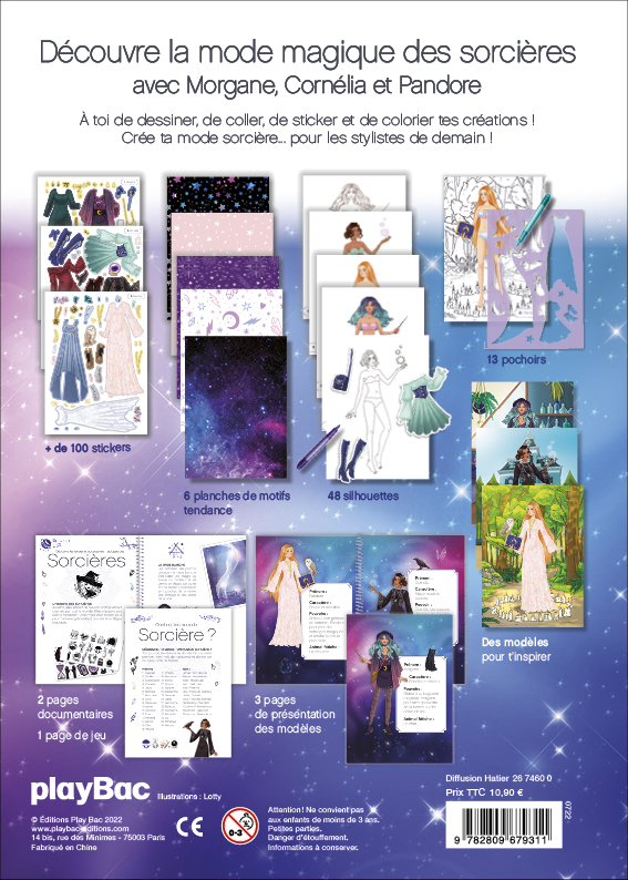 Découvre la mode magique des sorcières avec Morgane, Cornélia et Pandore.   À toi de dessiner, de coller, de sticker et de colorier tes créations. Crée ta mode sorcières…pour les stylistes de demain ! – Plus de 100 stickers – 6 planches de motifs tendance – 48 silhouettes à colorier et à habiller – 13 pochoirs – Des modèles pour t’inspirer – 3 pages de présentation des modèles – 2 pages documentaires et 1 page de jeu pour te plonger dans l’univers de la magie
