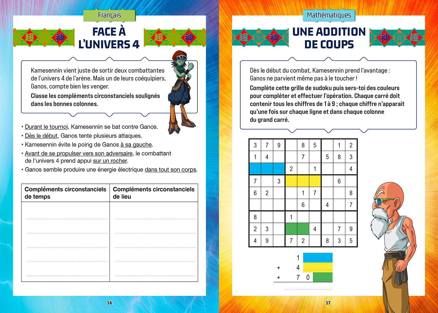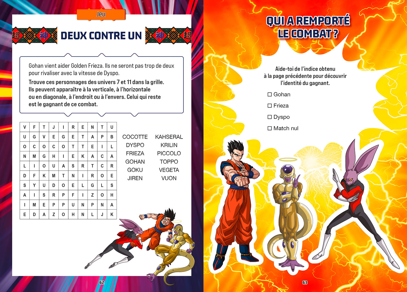 Les héros de l’univers 7 affrontent leurs adversaires. Récolte des indices au fil des exercices, pour découvrir les vainqueurs de chaque combat et bien sûr, le gagnant du grand tournoi.