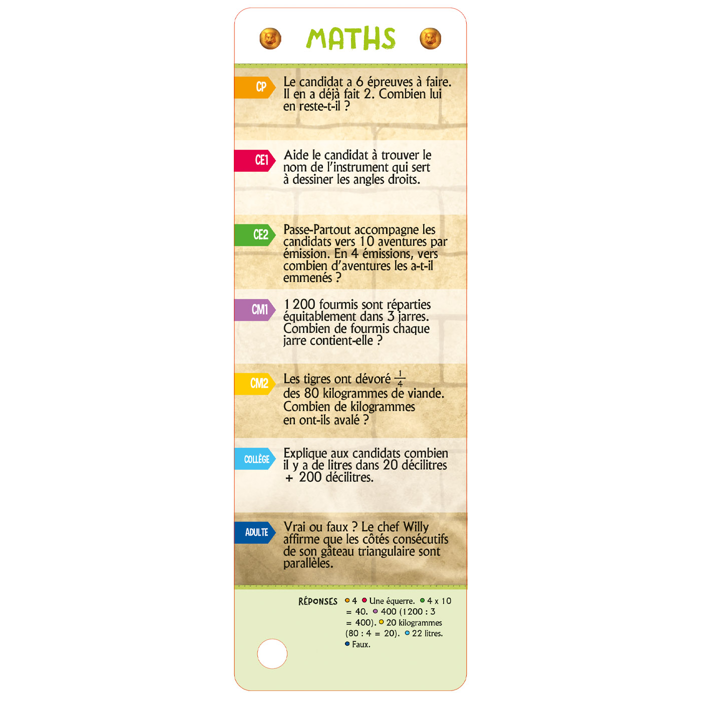 – 7 niveaux de difficulté : du CP au collège + un niveau adulte