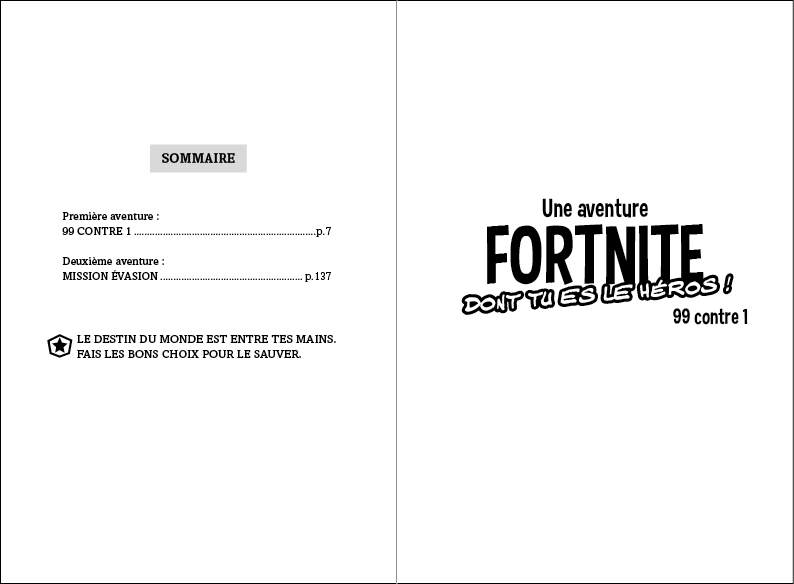 Une aventure FORTNITE dont du es le héros ! Édition royale. Intégrale saisons 1 et 2 SITUATION : année 2113, une catastrophe planétaire a fait disparaître 98% de la population de la Terre. La plupart des villes sont détruites et un combat sans merci a éclaté pour le contrôle des ruines. Tu as été formé au combat pour empêcher le règne de la terreur. TON NOM: Bob « Cold Blood » Mission 99 contre 1 : empêcher les hordes hostiles de s’emparer de Dark Dagalur. Mission évasion : porter secours à ton chef, retenu prisonnier dans la zone industrielle délabrée de Faded Factory. Pour réussir tes missions, tu devras éliminer les 99 ennemis qui barrent ta route. LE DESTIN DU MONDE EST ENTRE TES MAINS. FAIS LES BONS CHOIX POUR LE SAUVER. Zone de combat atteinte dans : CINQ… QUATRE… TROIS… DEUX… UN !