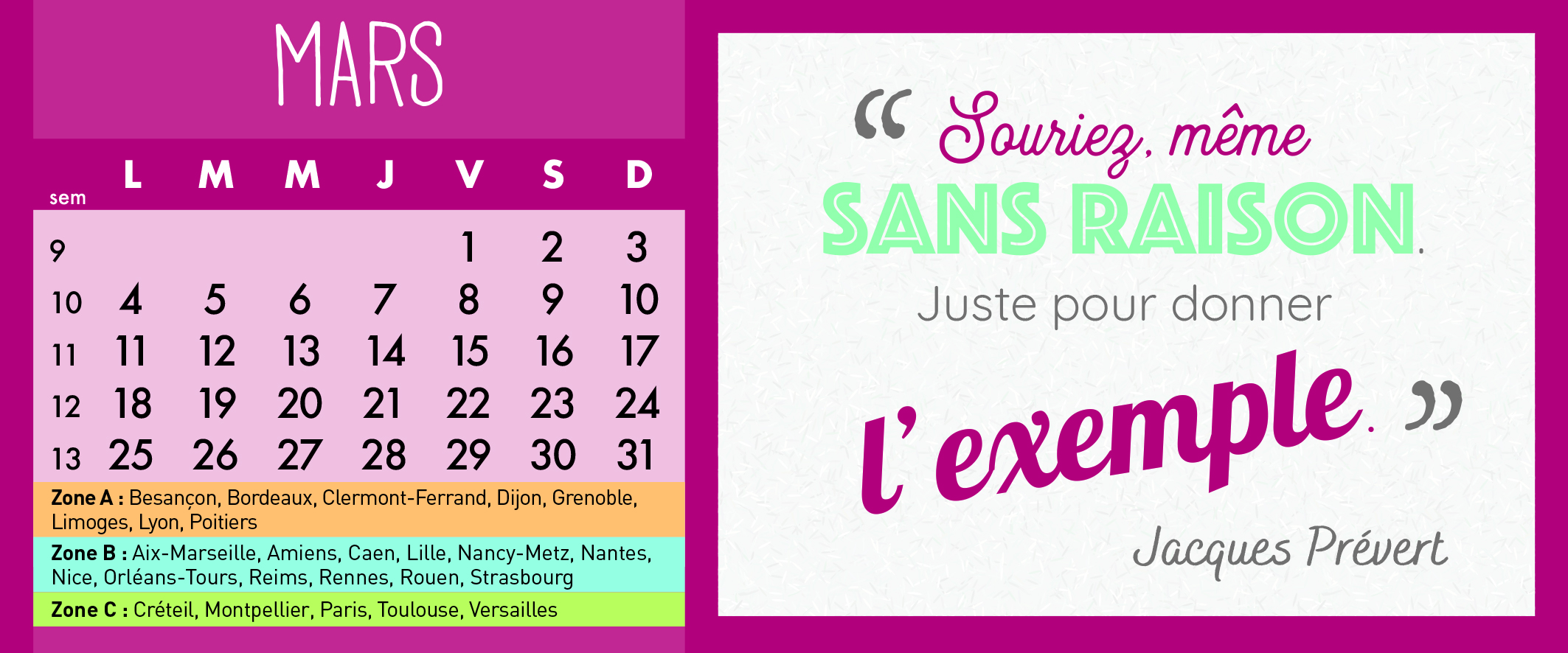 – 1 bloc calendrier du mois avec 1 défi par mois.