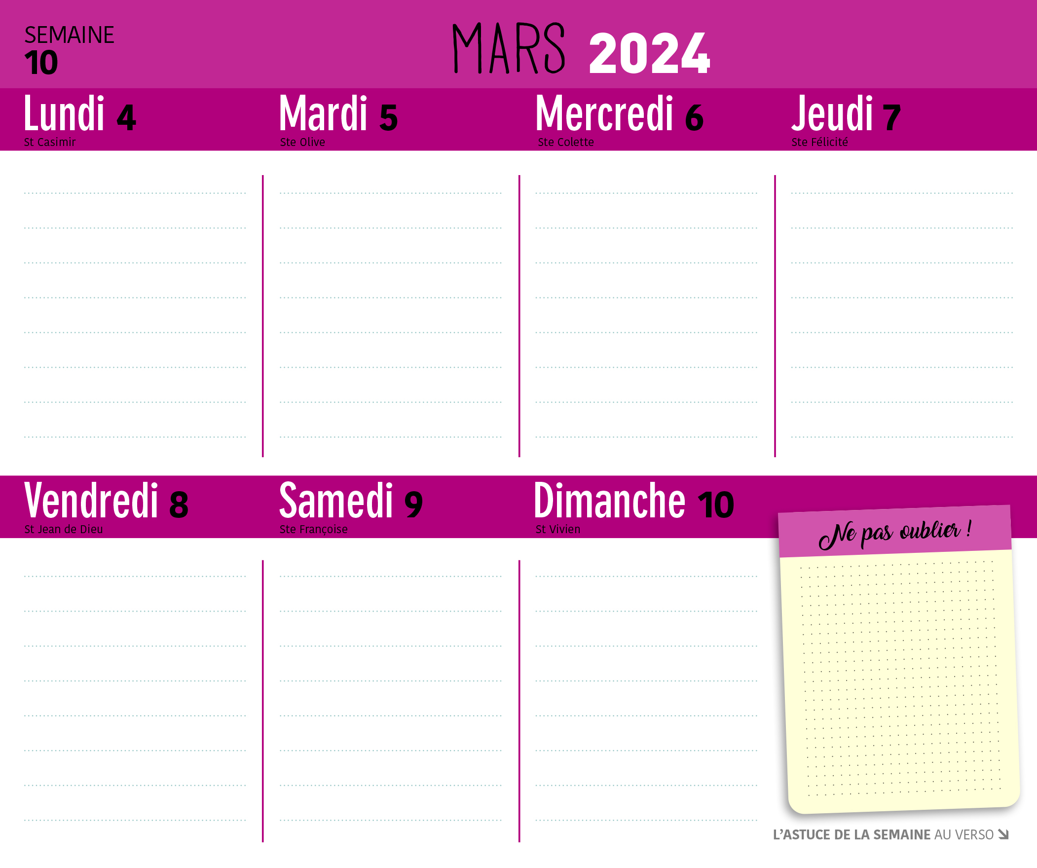 Au recto, le planning d'organisation par semaine permet de noter tous les événements de votre vie de famille. Au verso, des conseils pour avoir une maison bien aménagée, bien rangée et bien décorée pour améliorer votre qualité de vie et votre bien-être au quotidien.
