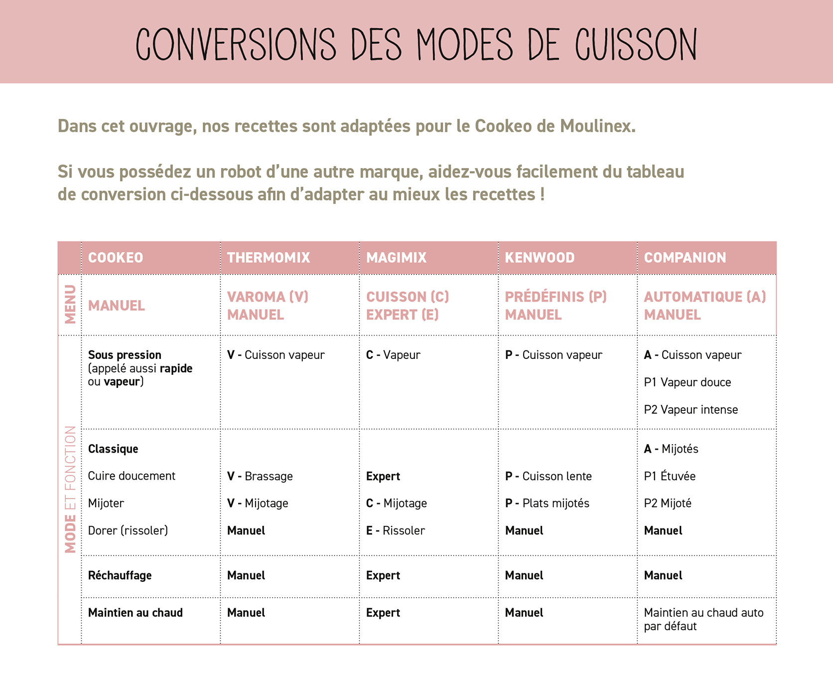 Au verso, 70 pages de recettes d'entrées, plats, desserts 100% renouvelées à réaliser au robot cuiseur (recettes compatibles pour tous les robots cuiseurs grâce à un tableau convertisseur).