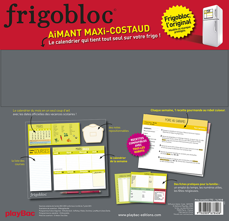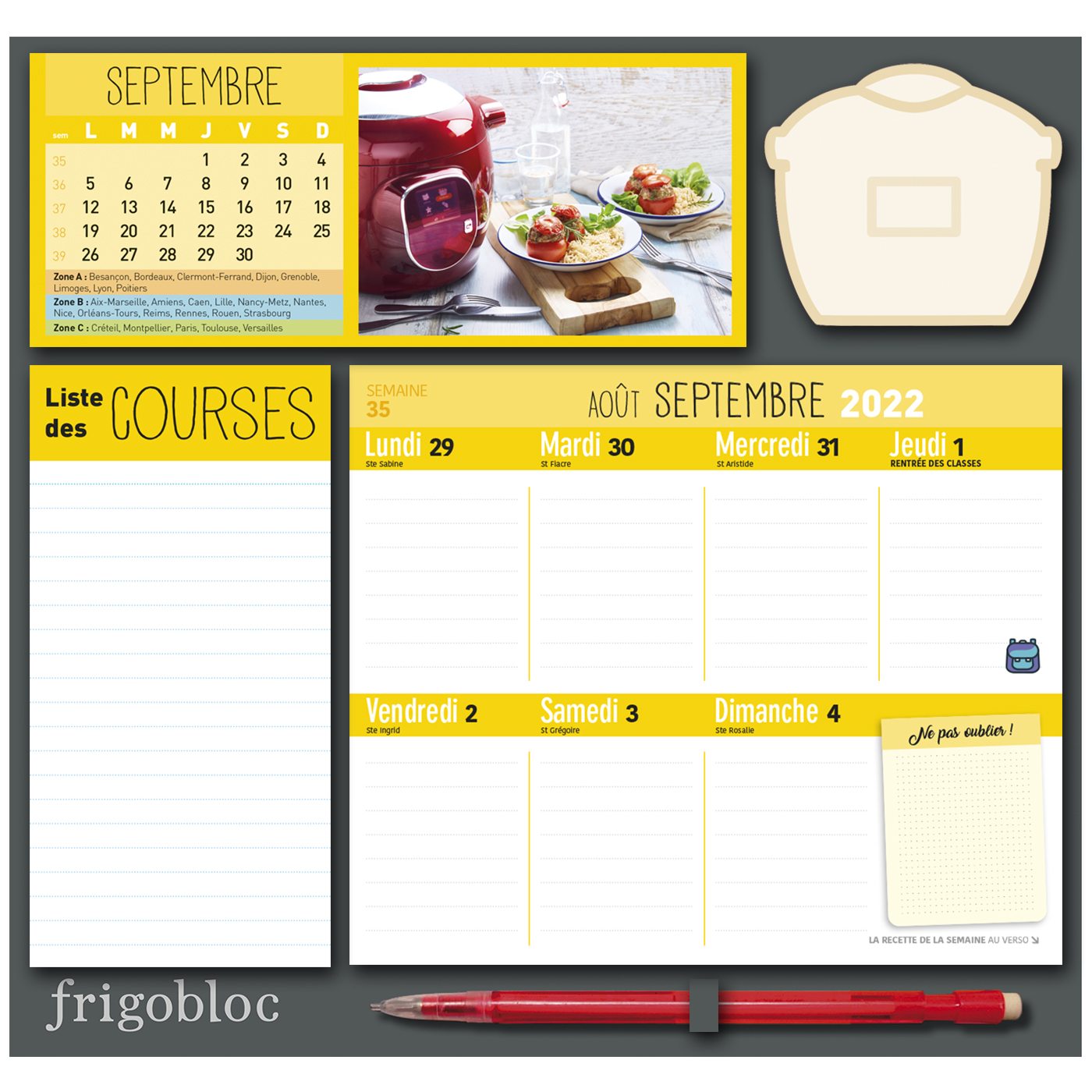 Avec ce calendrier maxi aimanté qui tient parfaitement sur tous les frigos (aimant renforcé), planifiez votre vie de famille de septembre 2022 à décembre 2023 et restez inspirés en cuisine ! Au recto, le planning d’organisation par semaine permet de noter tous les événements de votre vie de famille. Au verso, des recettes d’entrées, plats, desserts à réaliser au robot cuiseur (recettes compatibles pour tous les robots cuiseurs grâce à un tableau convertisseur). Avec en bonus des blocs de listes de courses, des notes repositionnables, l’emploi du temps des enfants et une fiche de numéros utiles.