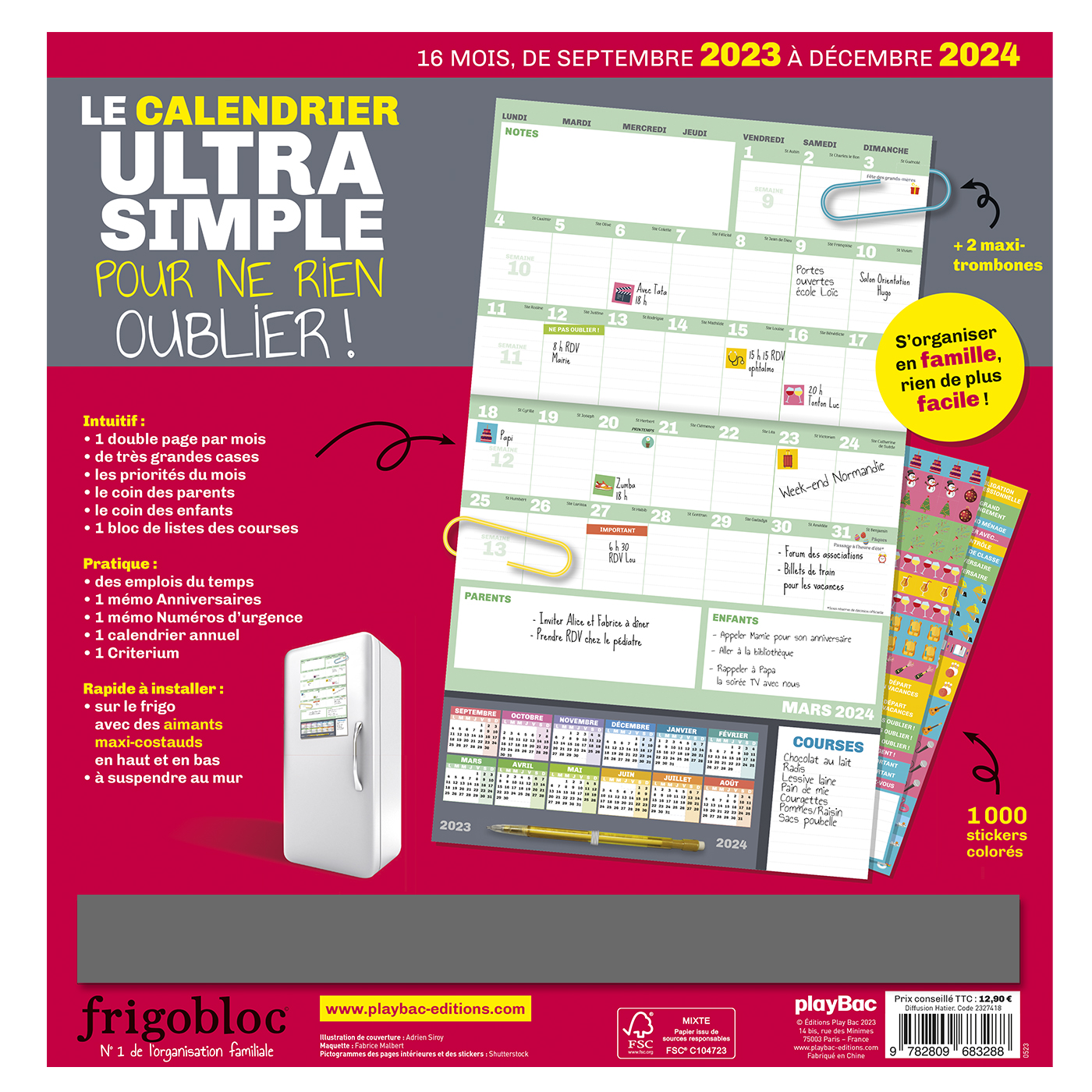 Pour trouver une librairie où acheter Frigobloc Le calendrier Ultra Simple pour une famille organisée ! (de sept. 2023 à déc. 2024), on vous invite à visiter le site Place des libraires !Place des Libraires