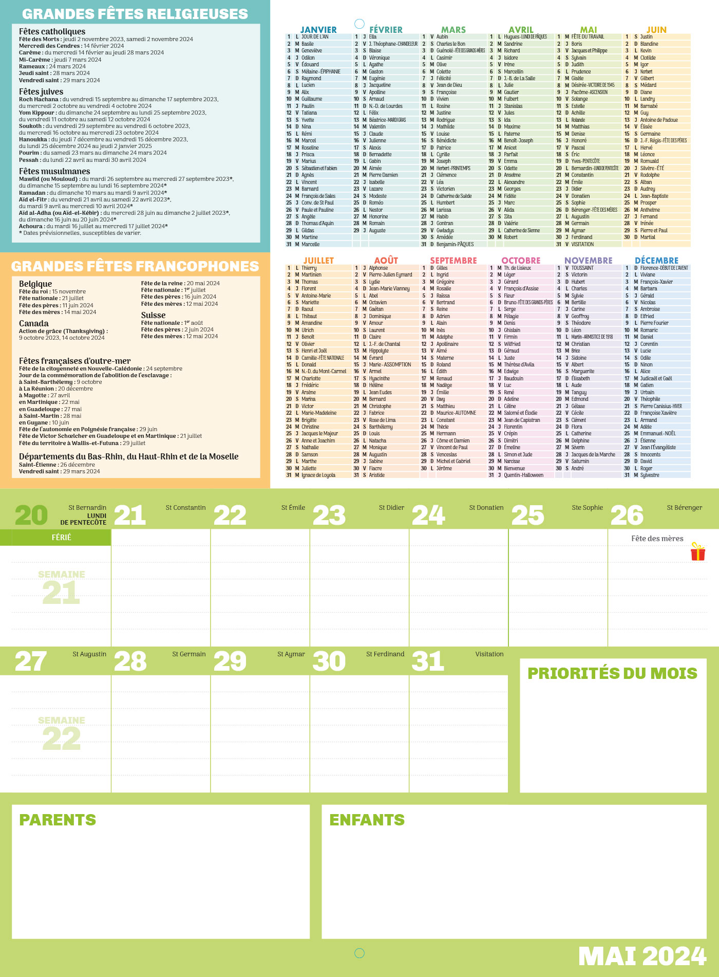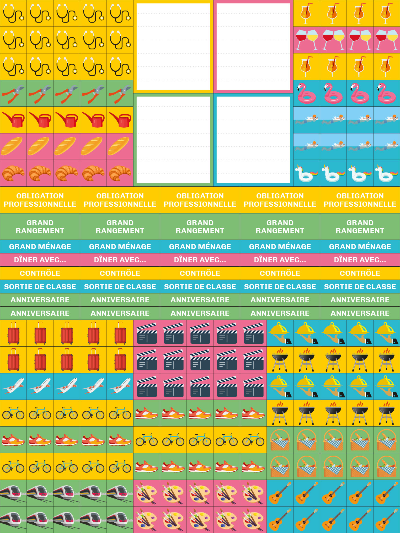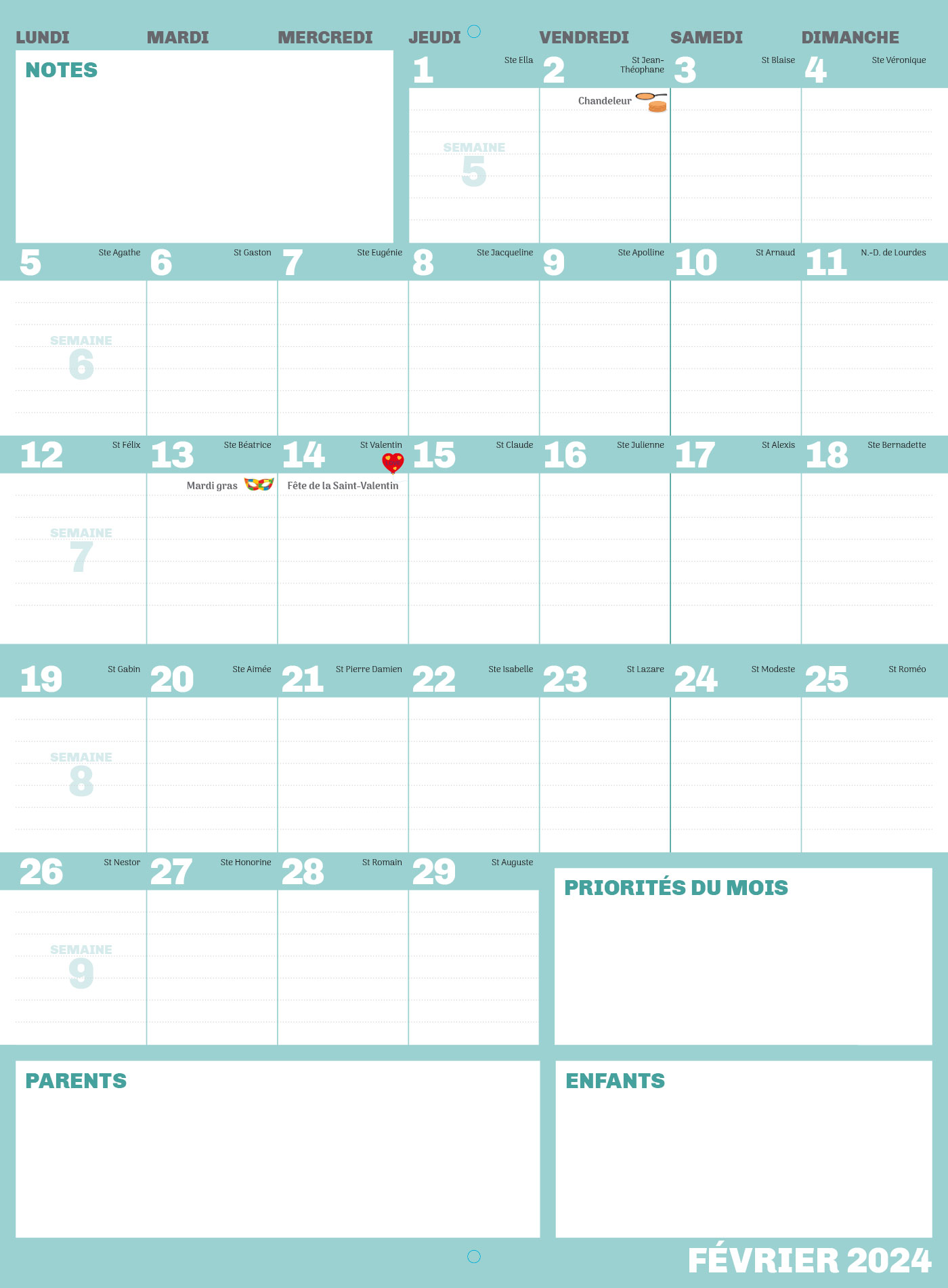 2 pages par mois, avec des très grandes cases, pour tout noter, un espace dédié aux priorités du mois, une zone mémo pour les parents, une zone mémo pour les enfants… et c'est tout (mais c'est déjà pas mal) !
