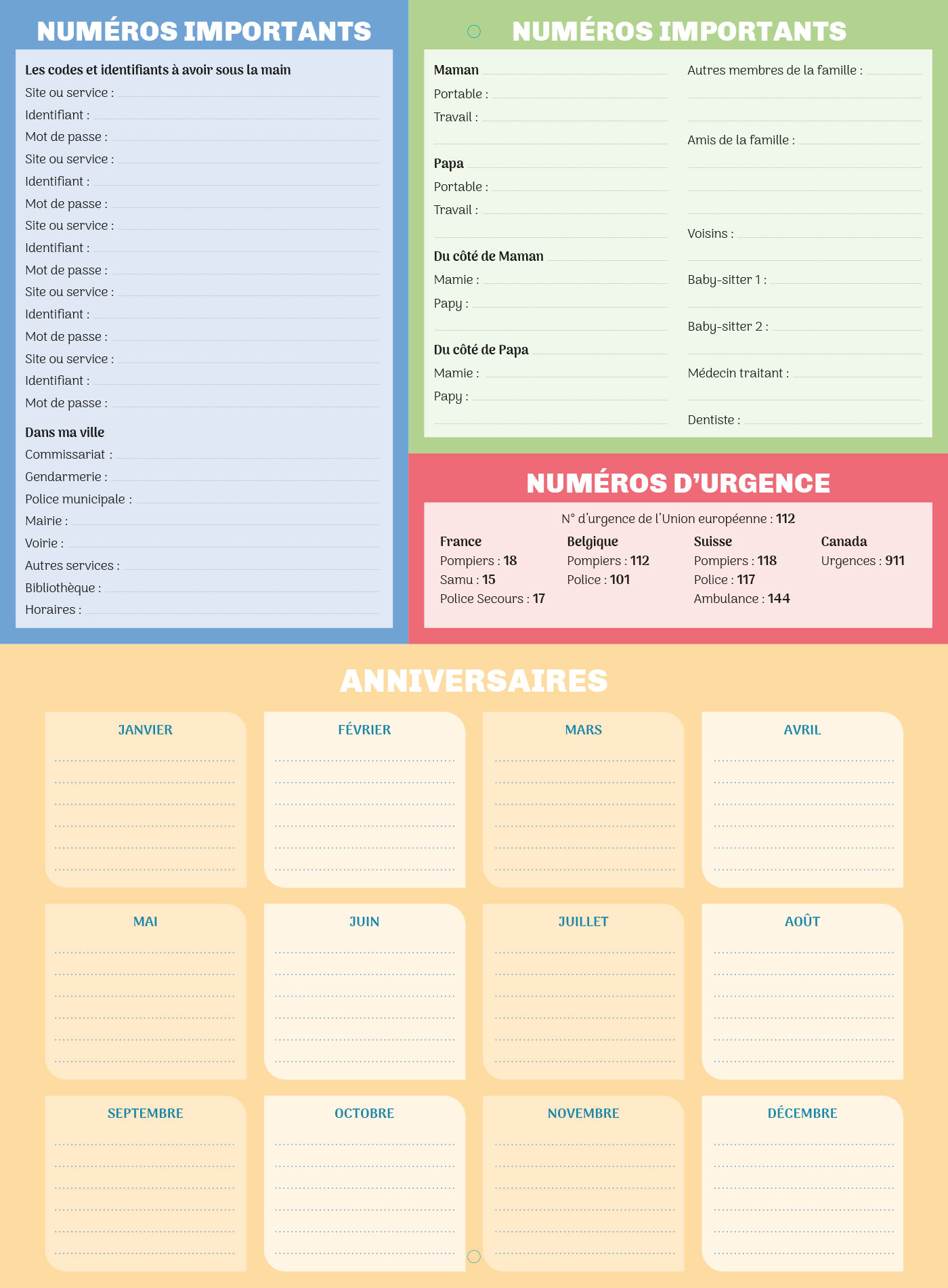 – Des fiches pratiques pour gérer le quotidien (emplois du temps, mémo anniversaires, numéros d’urgences…)