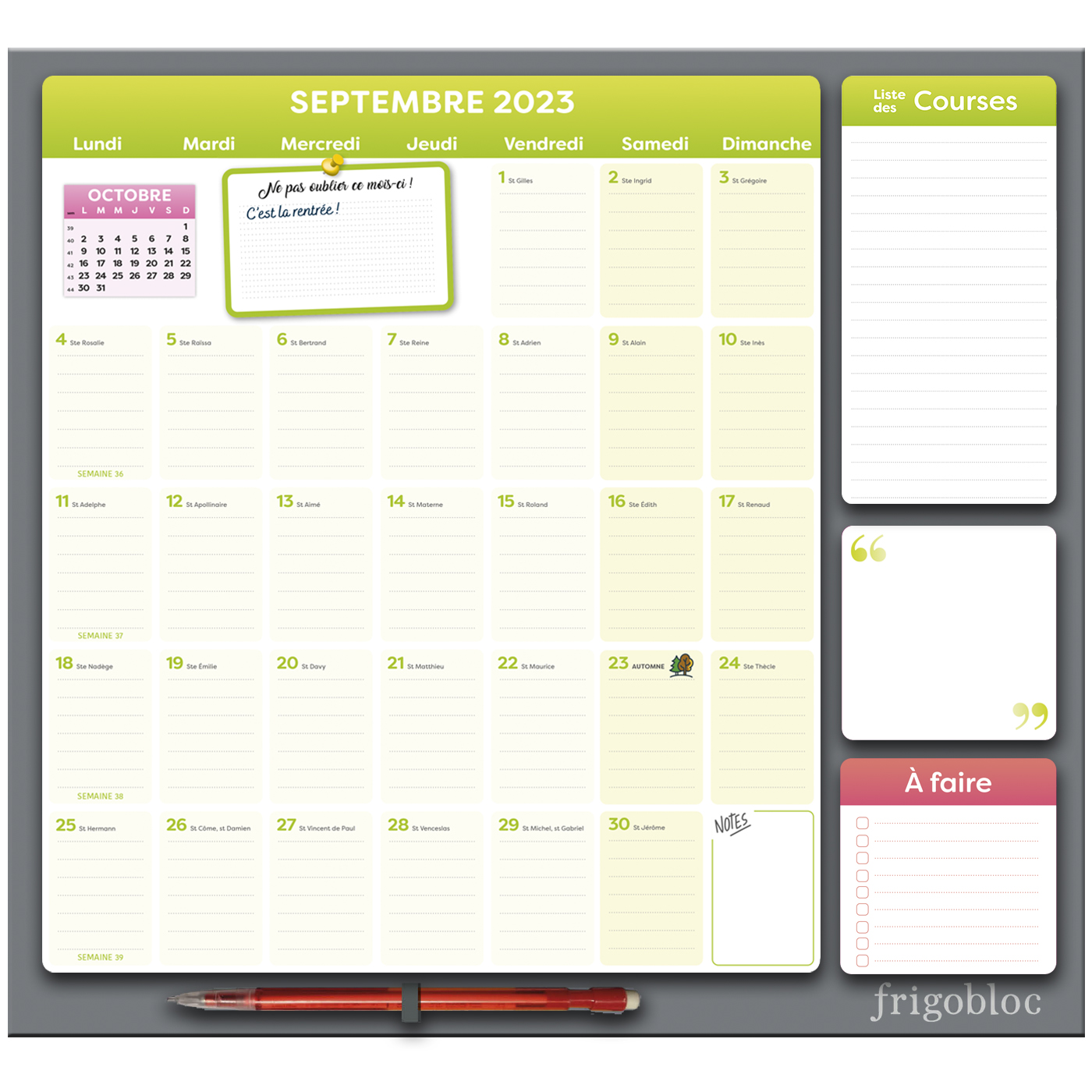 Avec ce calendrier qui tient parfaitement sur tous les modèles de frigos grâce à son maxi aimant, planifiez tout sur 16 mois, de septembre 2023 à décembre 2024.