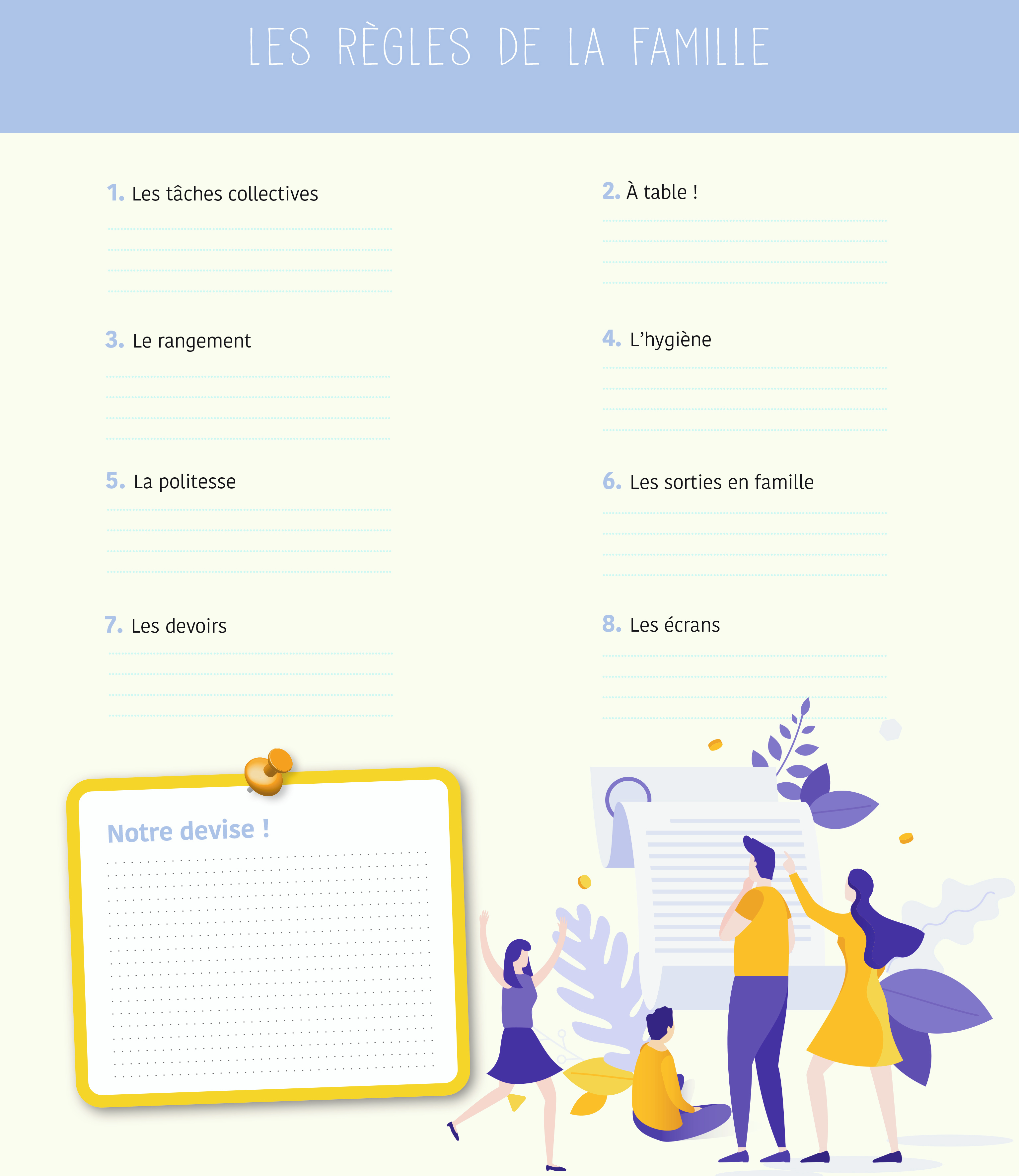 – des fiches pratiques pour gérer le quotidien (numéros utiles, tableau de mission, to-do list des vacances, règles de la famille…).