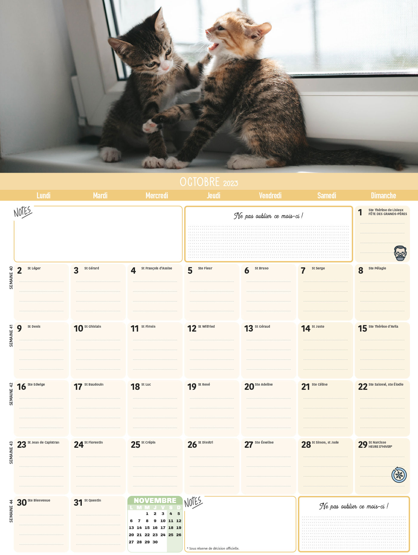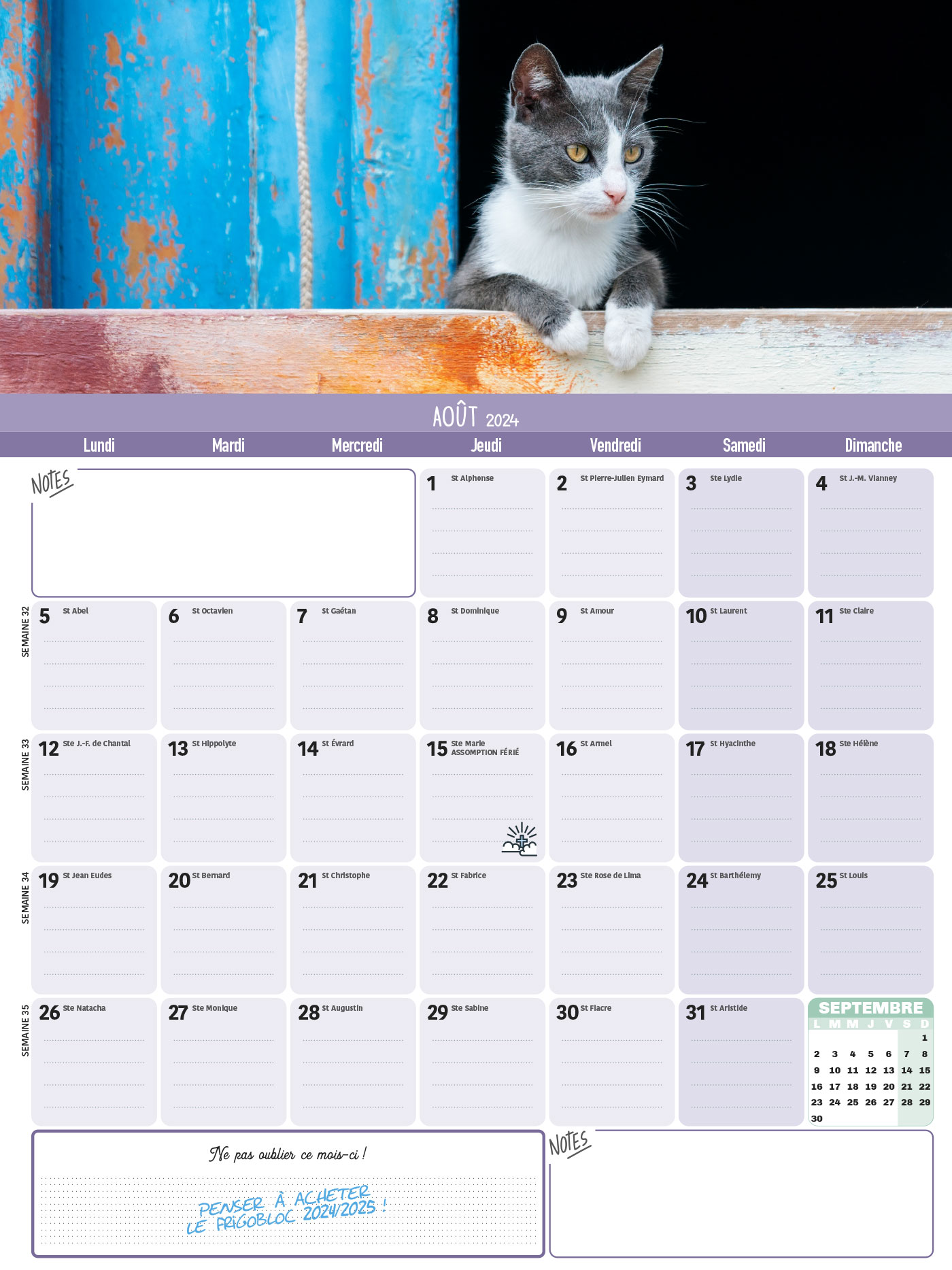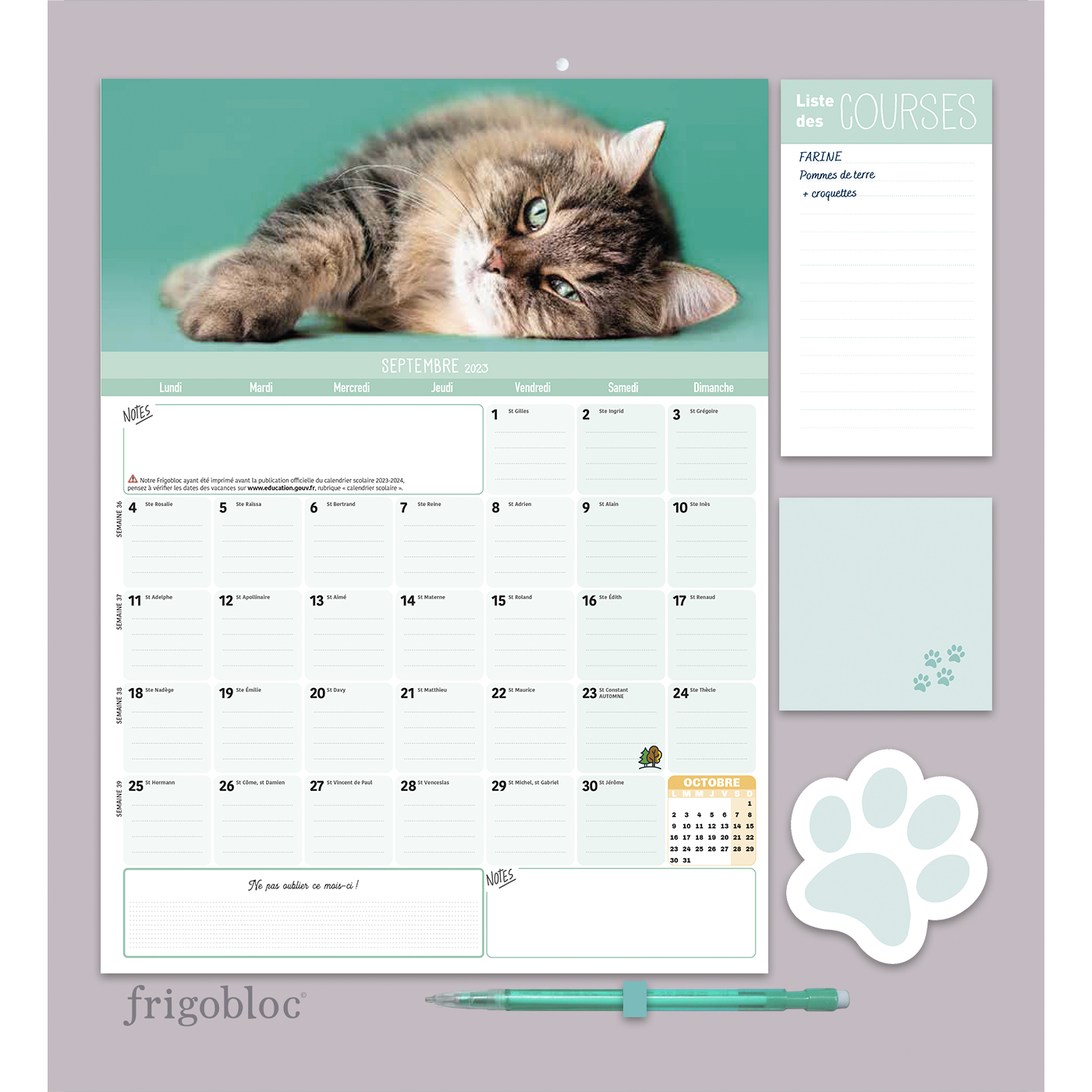 Avec ce calendrier Frigobloc spécial Chats, maxi aimanté qui tient parfaitement sur tous les modèles de frigos grâce à son maxi aimant, planifiez tout sur 16 mois, de septembre 2023 à décembre 2024. Le planning d'organisation par mois permet de tout noter et de ne rien rater de la vie familiale, et chaque mois, retrouvez une belle et grande photo de vos chats préférés.