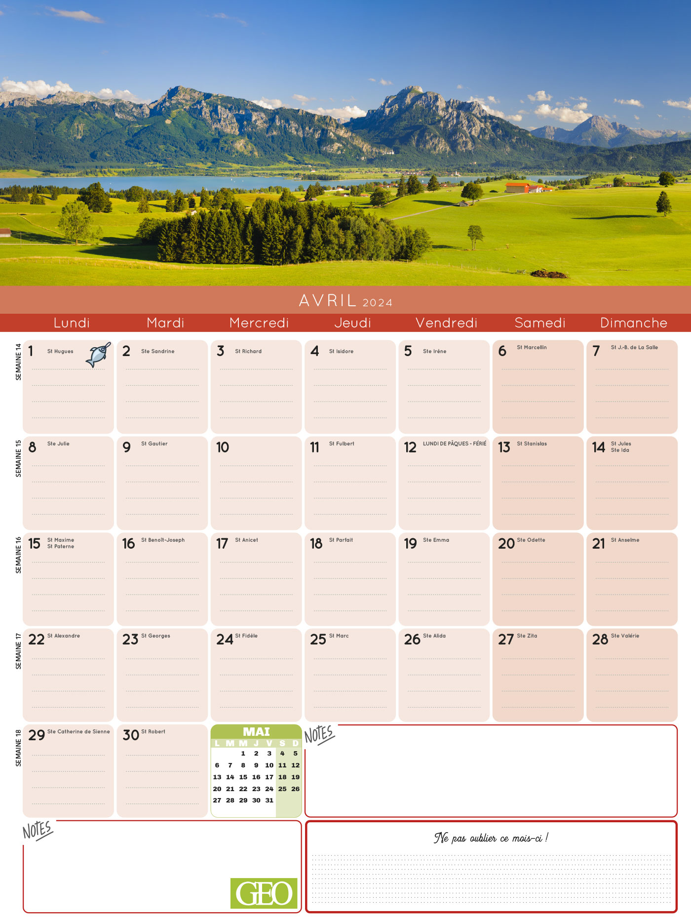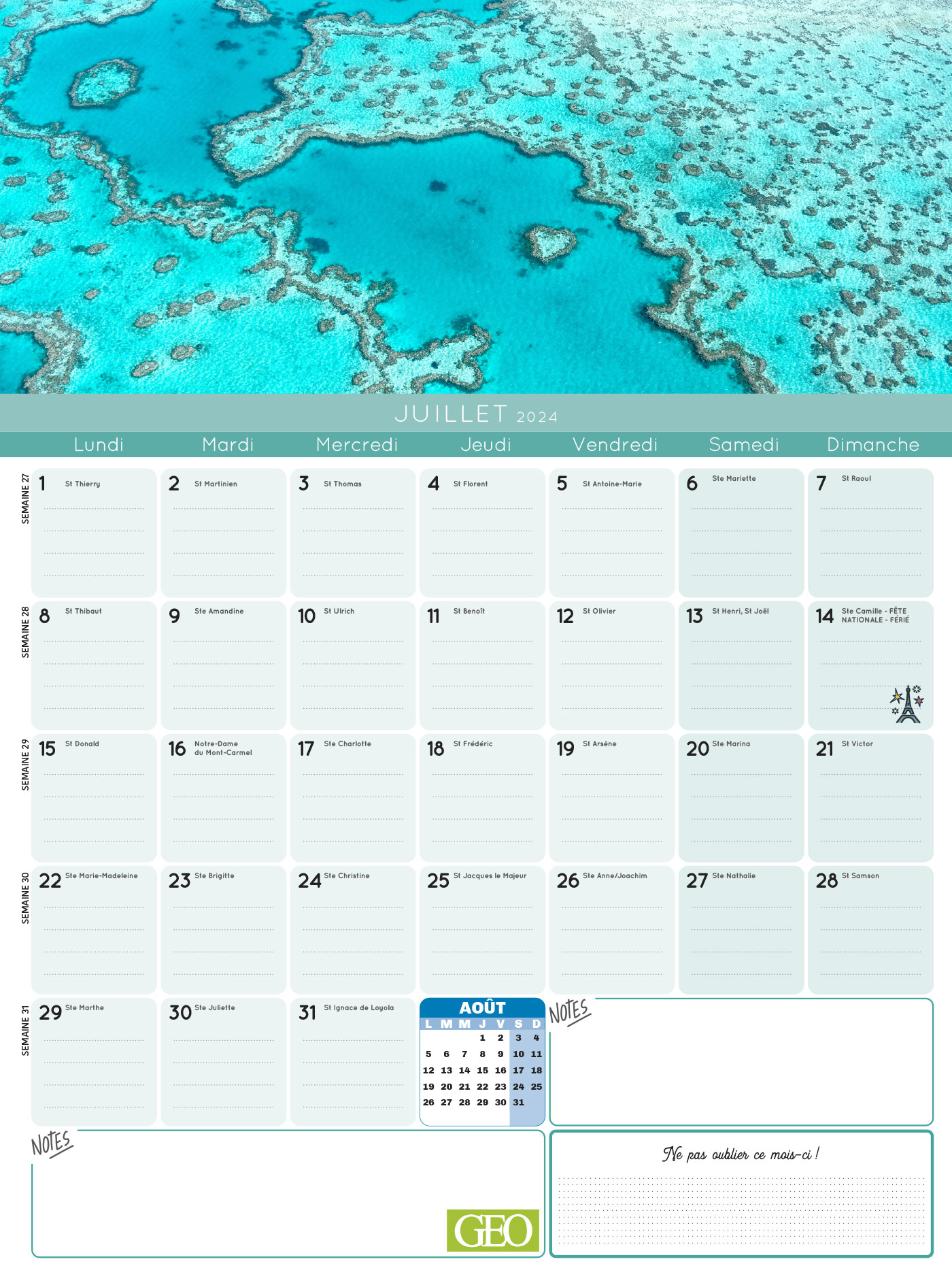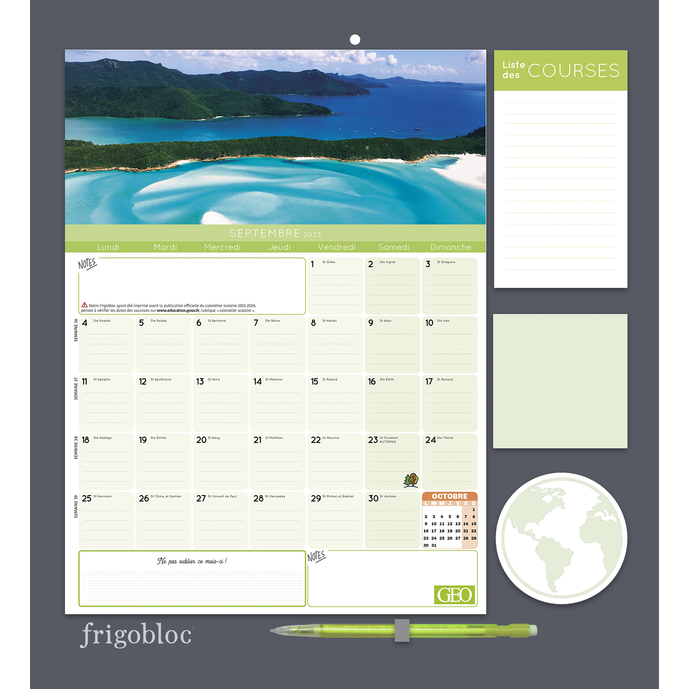 Avec ce calendrier Frigobloc spécial Géo, maxi solide qui tient parfaitement sur tous les modèles de frigos grâce à son maxi aimant, planifiez tout sur 16 mois, de septembre 2023 à décembre 2024. Le planning d'organisation par mois permet de tout noter et de ne rien rater de la vie familiale, et chaque mois, retrouvez une belle et grande photo GEO pour vous évader à travers le monde.