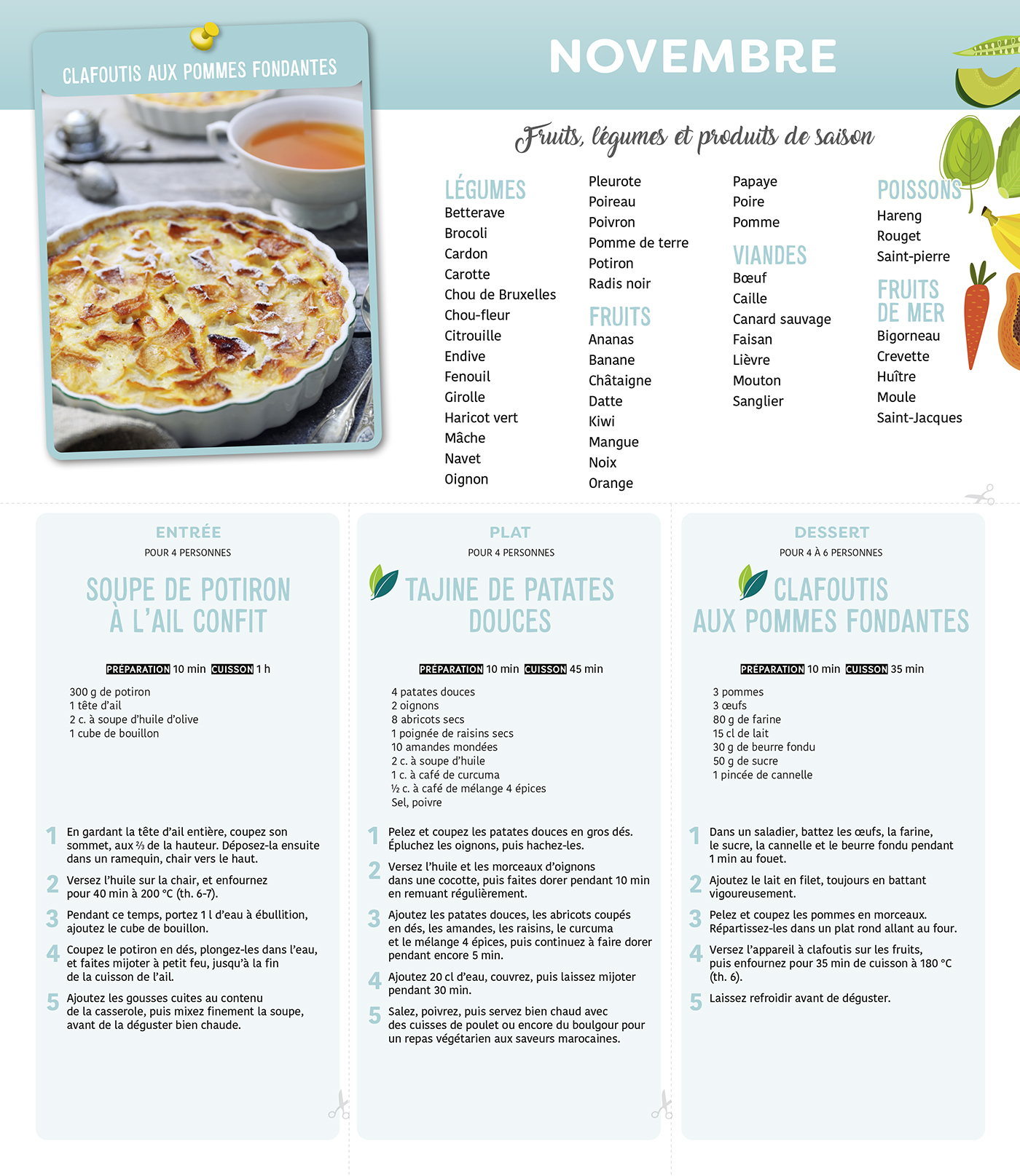 – De nombreuses recettes de cuisine 100% renouvelées (dont des recettes pour les imprévus : invités de dernière minute, goûters improvisés pour les enfants, recettes express du soir, recettes légères lendemain de fêtes…)