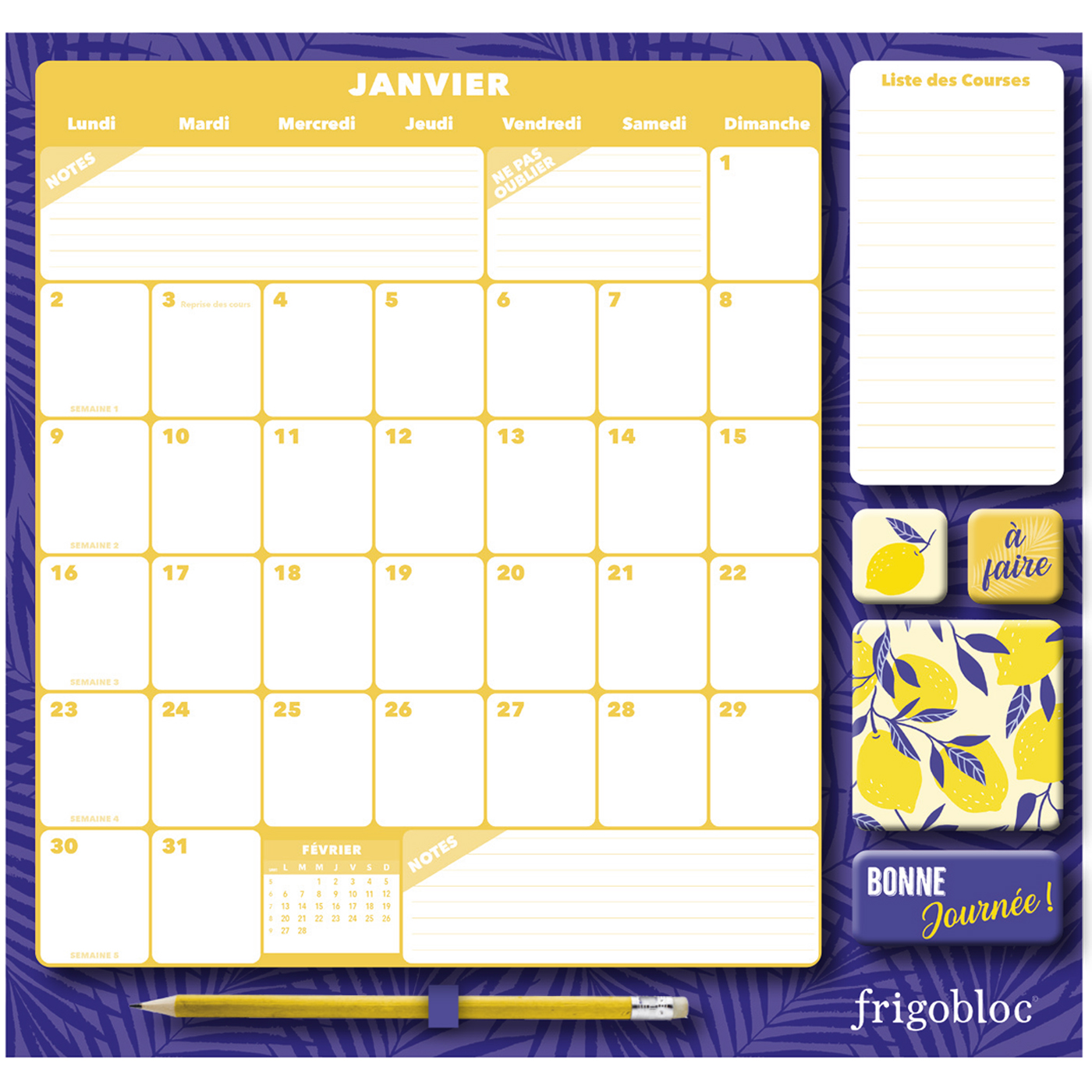 Avec ce calendrier maxi aimanté qui tient parfaitement sur tous les frigos, planifiez tout de janvier à décembre 2023 en apportant une touche déco à votre intérieur. Le planning d’organisation par mois, avec de grandes cases, permet de tout noter et de ne rien rater de la vie familiale. Avec un bloc de listes de courses, 4 superbes aimants pour accrocher vos papiers et décorer votre frigo et des fiches pratiques pour s’organiser seul ou en famille : numéros utiles, mémo anniversaire, priorités du mois, qui fait quoi, emploi du temps.