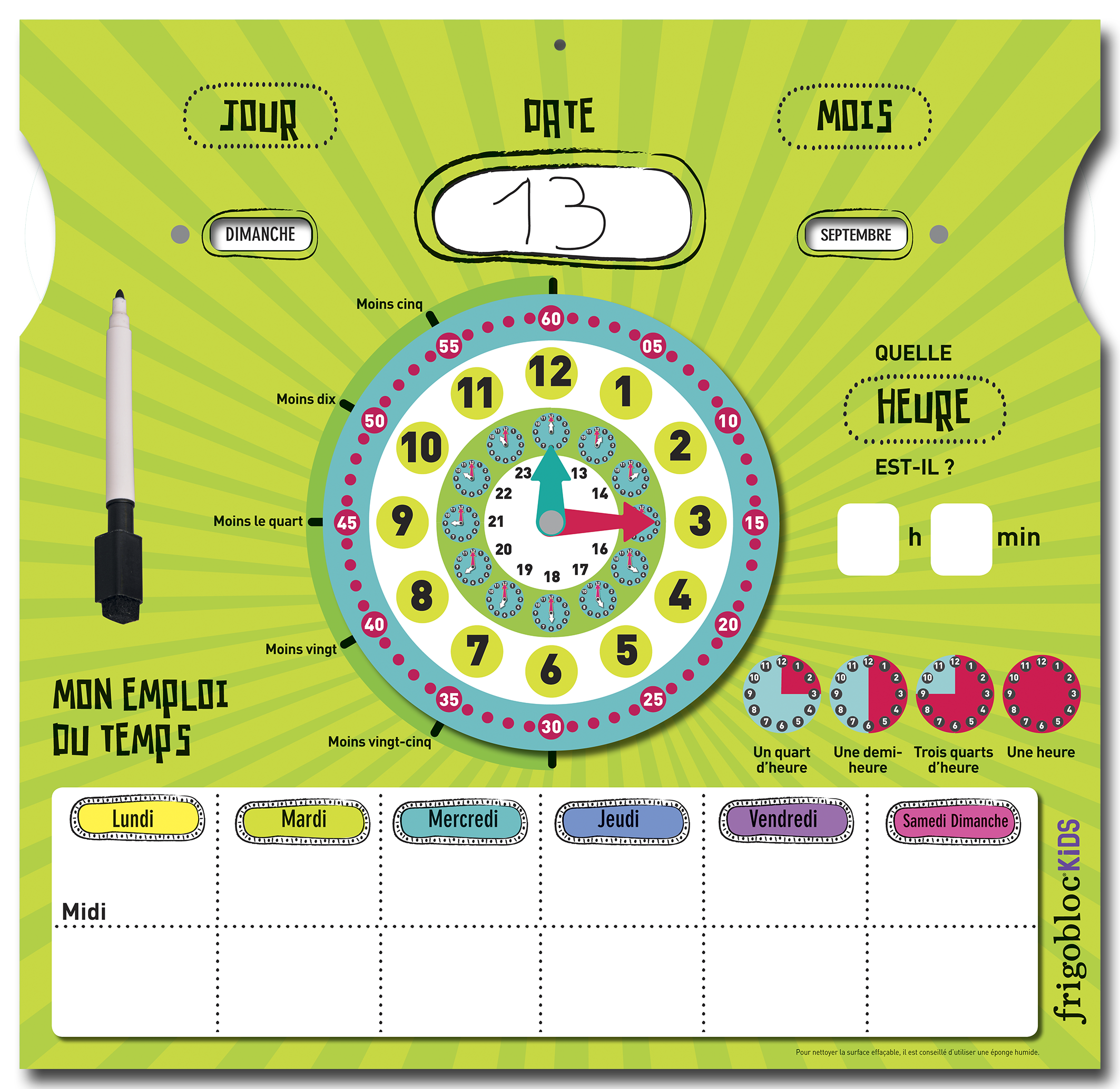 Un outil pédagogique et pratique pour accompagner votre enfant dans l'apprentissage de l'heure et du temps ! Une horloge multi-cadran, la date du jour, un espace effaçable pour écrire l'heure, un emploi du temps de la semaine…. tout est réuni sur un tableau à mettre dans la cuisine ou dans la chambre. Un rituel quotidien à partager avec son enfant !