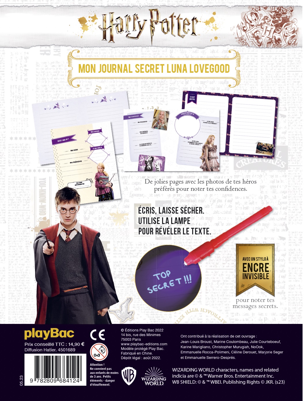 Ce journal contient de jolies pages illustrées pour retrouver tout l'univers d'Harry Potter et de Poudlard, un stylo à encre invisible et un cadenas doré (+ clés) pour bien enfermer tes secrets.
