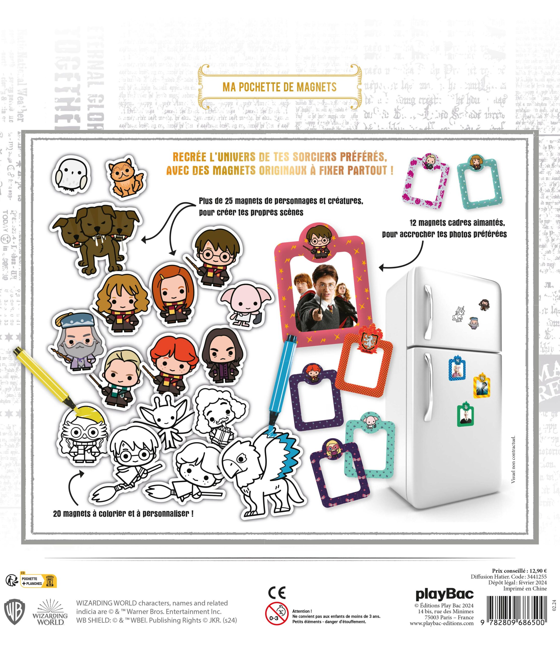 Dans cette grande pochette : 27 magnets de personnages et créatures pour créer tes propres scènes; 12 magnets cadres aimantés pour accrocher tes photos préférées; 20 magnets à colorier et à personnaliser.
