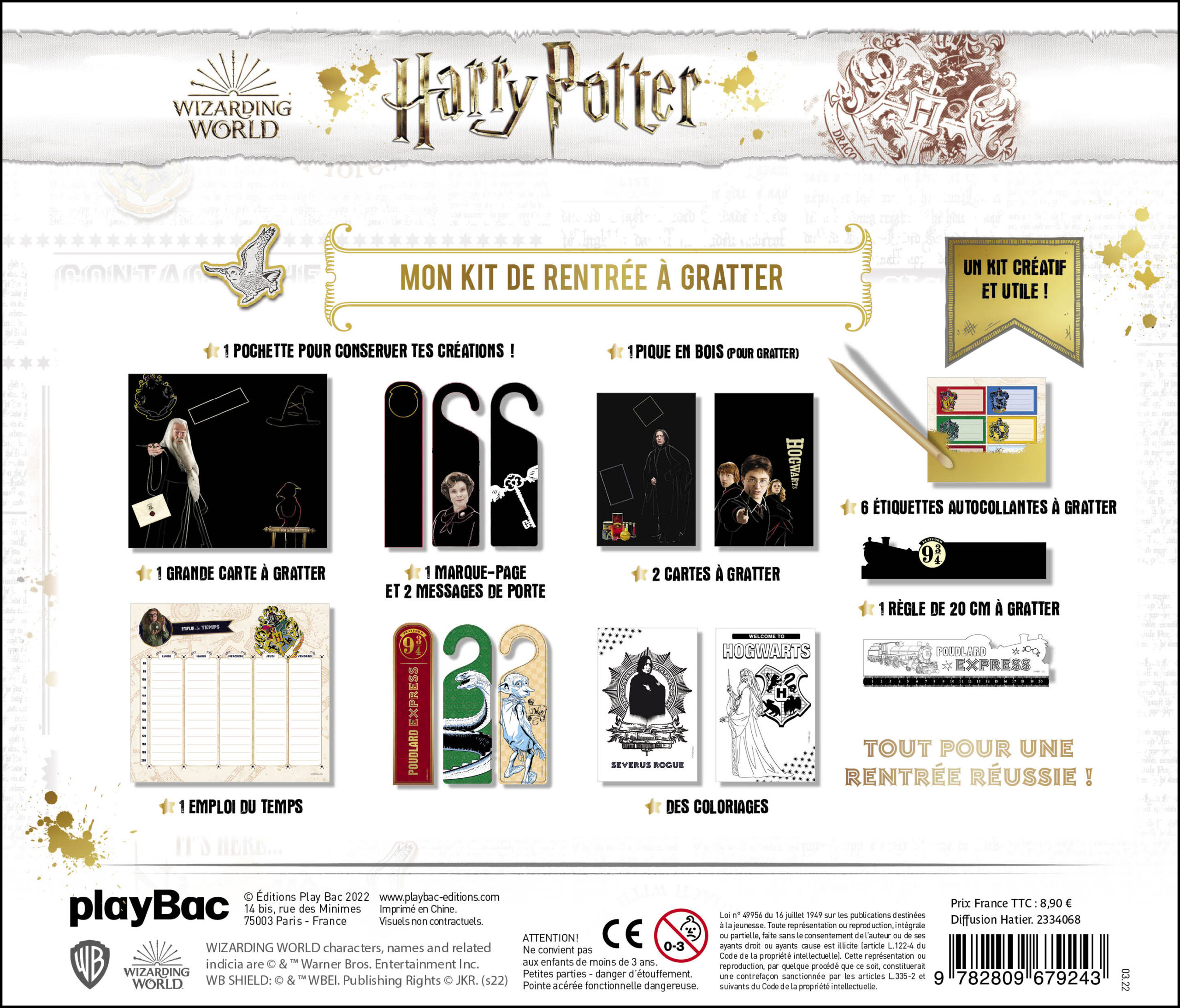 Dans ce kit inédit de rentrée, retrouvez l'univers d'Harry Potter et préparez la rentrée des classes avec du matériel à gratter ! Le kit contient : – 1 grande carte à gratter ; – des cartes à gratter pour personnaliser votre agenda scolaire entre autres ; – 6 étiquettes autocollantes ; – des marque-pages ; – des accroche-portes ; – 1 règle de 20 cm (le tout à gratter) ; – 1 pique en bois pour gratter facilement. Il contient également 1 grand emploi du temps à compléter. Une activité créative idéale pour tous les fans du plus célèbre des sorciers et de Poudlard !