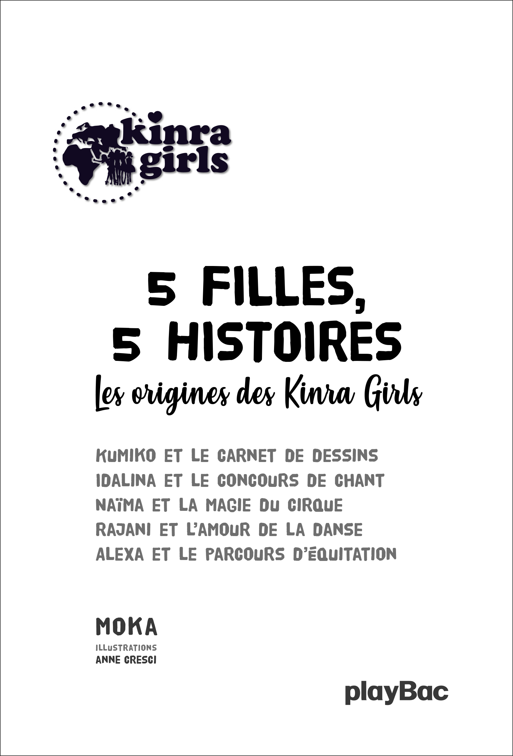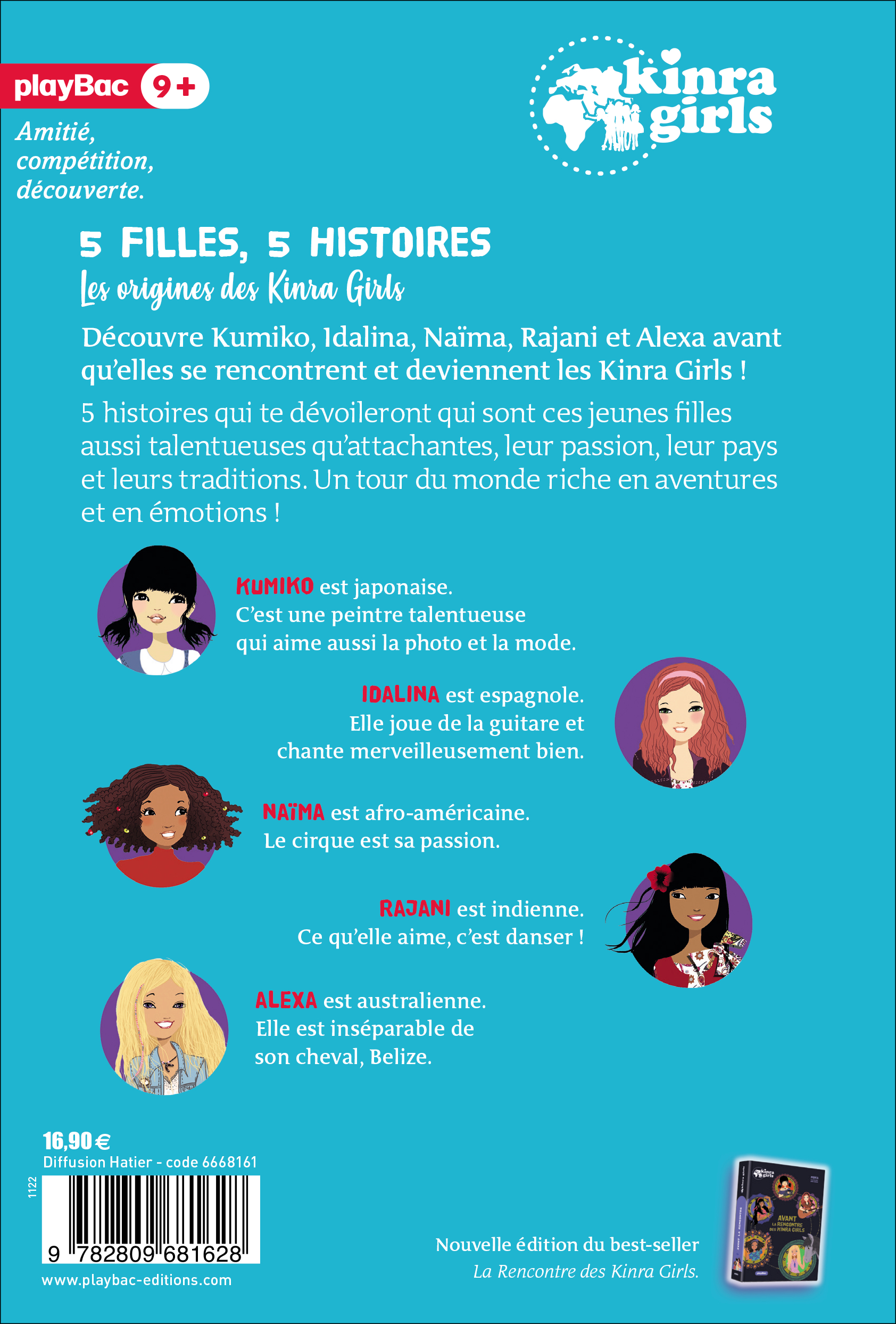5 histoires à dévorer pour faire le tour du monde et découvrir Kumiko, Idalina, Naïma, Rajani et Alexa avant qu’elles entrent à l’académie Bergström, se lient d’amitié… et qu’elles deviennent les Kinra Girls ! Kumiko est japonaise. C’est une peintre talentueuse qui aime aussi la photo et la mode. Idalina est espagnole. Elle joue de la guitare et chante merveilleusement bien. Naïma est afro-américaine. Le cirque est sa passion. Rajani est indienne. Ce qu’elle aime, c’est danser. Alexa est australienne. Elle est inséparable de son cheval Belize.