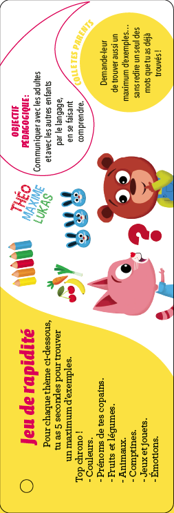 Depuis 1989, Les incollables accompagnent les enfants sur la route de l’apprentissage et du jeu. Les questions-réponses offrent un moment de jeu, de convivialité et de connaissance aussi. Eh oui, car selon nous, on n’apprend jamais mieux que quand on y prend du plaisir ! Dans ce titre : 150 quiz à emporter partout. L’essentiel du programme de la petite section en questions-réponses pour réviser en s’amusant et préparer la rentrée tout en douceur. Les incollables, un concept unique et innovant déjà adopté par plus de 50 millions d’enfants.