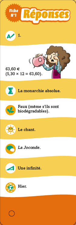 Depuis 1989, Les incollables accompagnent les enfants sur la route de l’apprentissage et du jeu. Les questions-réponses offrent un moment de jeu, de convivialité et de connaissance aussi. Eh oui, car selon nous, on n’apprend jamais mieux que quand on y prend du plaisir ! Dans ce titre : 350 quiz à emporter partout. L’essentiel du programme de CM1 en questions-réponses pour réviser en s’amusant et préparer la rentrée tout en douceur. Les incollables, un concept unique et innovant déjà adopté par plus de 50 millions d’enfants.
