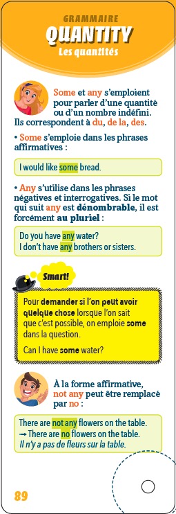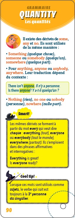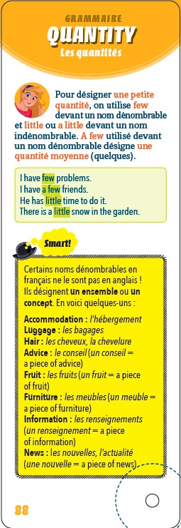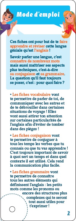 Un mémo complet pour être un crack en anglais. Ce titre contient : > des leçons ; > des astuces et des repères ; > des méthodes d’apprentissage. Table des matières : > Vocabulaire : le quotidien, l’humeur du jour, se présenter, les loisirs, la famille, la date, l’heure, au restaurant, demander son chemin… > Grammaire : les pronoms, les adjectifs, les articles, les comparatifs, la fréquence, les quantités, le discours indirect… > Conjugaison : to be, to have, les temps, les verbes irréguliers, depuis, la capacité, l’obligation, le conseil, la permission…
