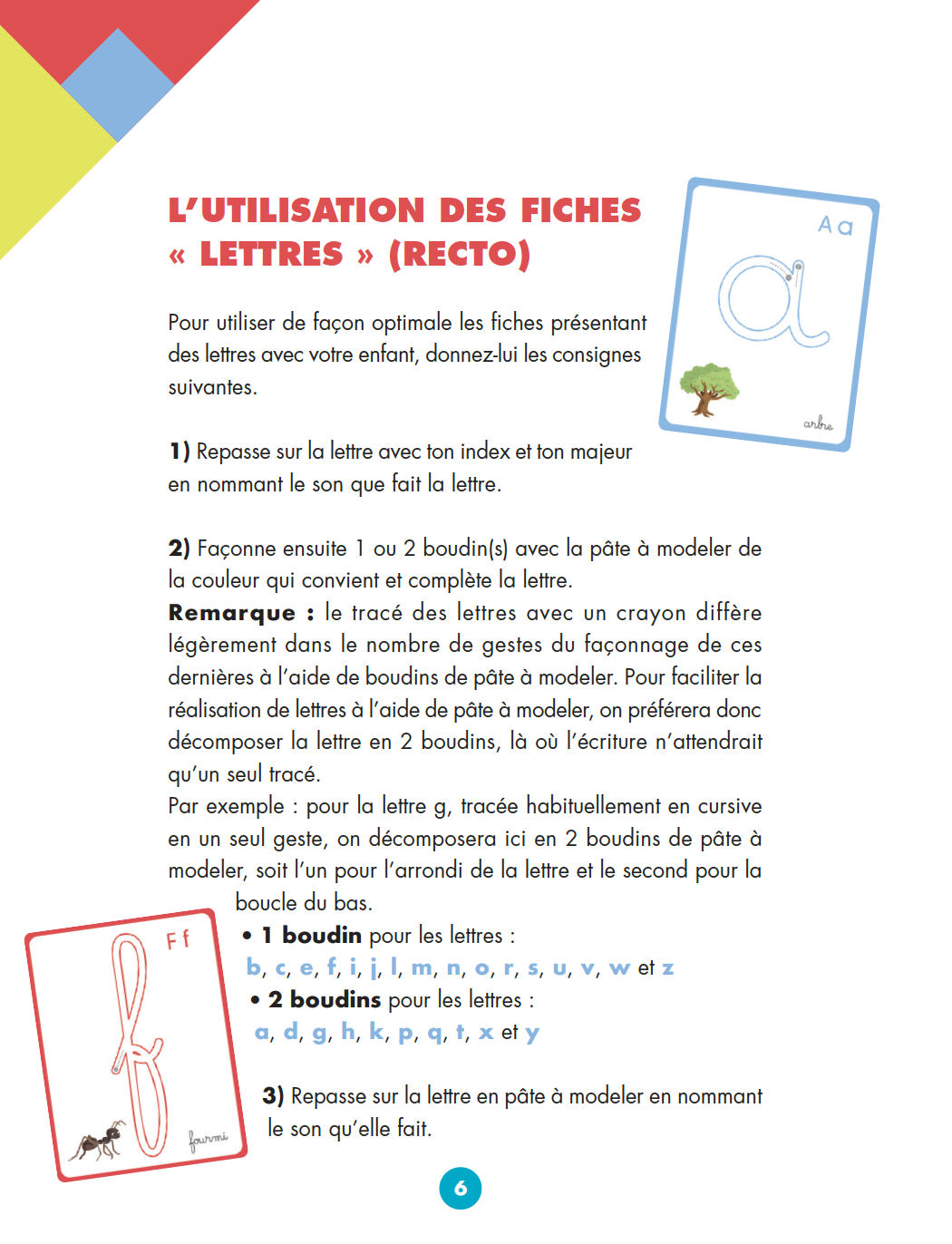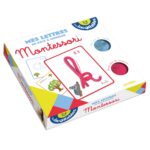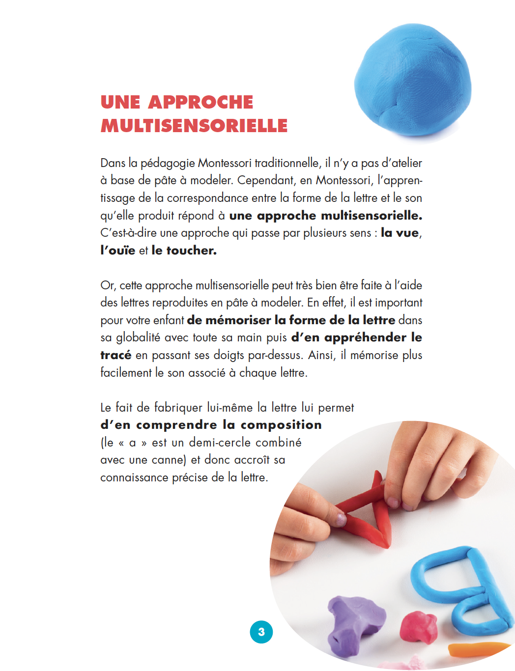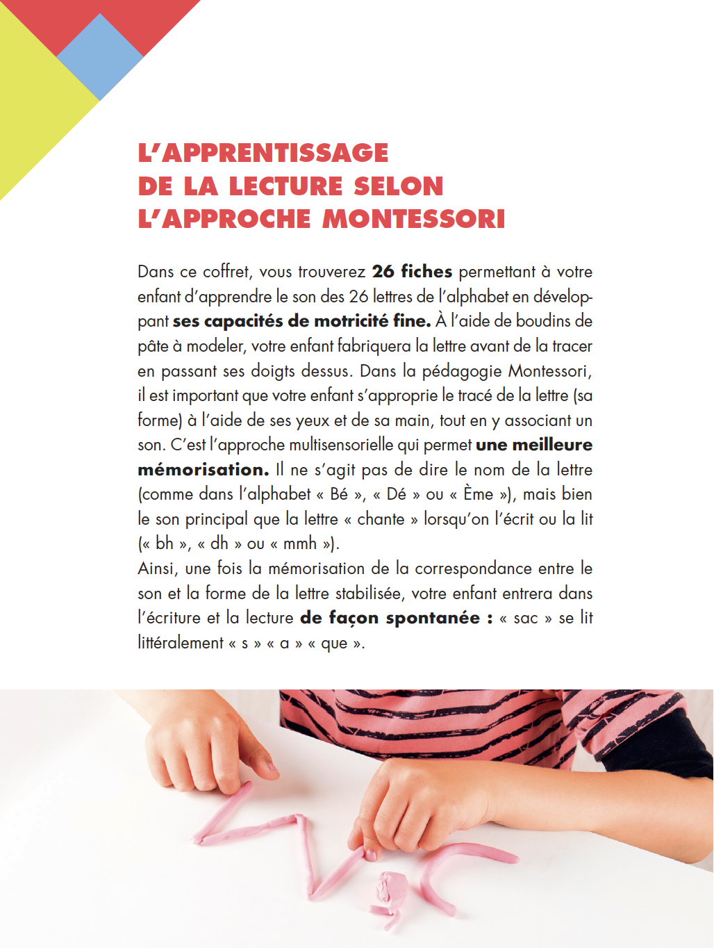 La pédagogie Montessori encourage une approche sensorielle de l’apprentissage. Grâce à la pâte à modeler et aux modèles de lettres, votre enfant se familiarisera de manière sensorielle et ludique avec la forme des lettres cursives. Conçu avec l’aide de spécialistes de la méthode Montessori, ce coffret propose des activités adaptées au développement de la motricité fine et à l’apprentissage de l’écriture. Ce coffret contient : – 26 fiches géantes 21 × 16 cm (avec 26 modèles de lettres et 26 activités de graphisme, lecture et écriture) ; – 2 pots de pâte à modeler rouge et bleue de 40 g ; – 1 livret pour les parents : une introduction à la pédagogie Montessori et des conseils pour utiliser le matériel et accompagner son enfant.