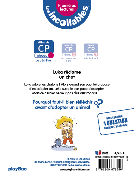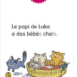 CP : Niveau 1 – Je déchiffre. Le papi de Luka a eu une portée de chatons. Le petit garçon aimerait beaucoup en avoir un, ces petits chats sont si mignons ! Mais son papa le met en garde : un petit animal implique de grandes responsabilités. Pourquoi faut-il réfléchir avant d’adopter un animal ? Dès 6 ans.