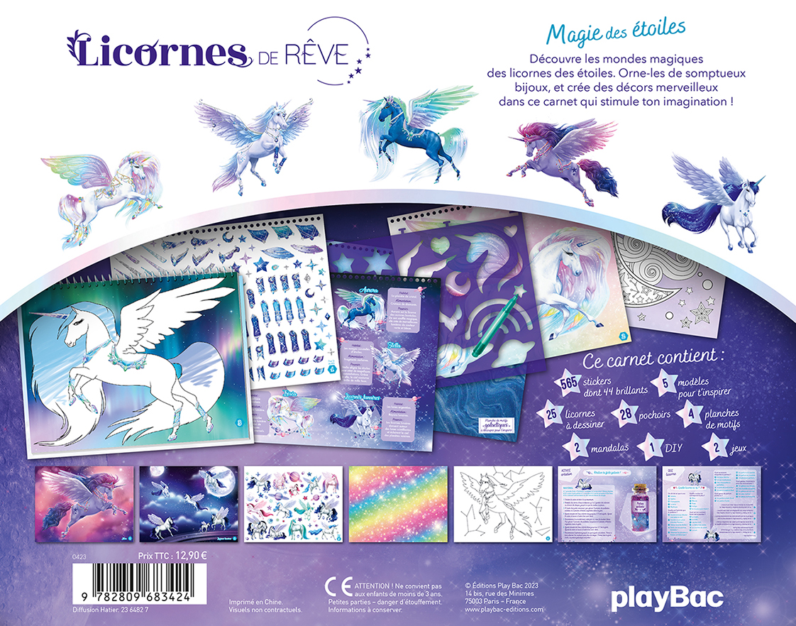 Un grand carnet créatif avec plus de 500 autocollants de Licornes, des pages de dessins, des coloriages, des pochoirs, des planches de motifs à découper, des jeux et des modèles pour s'inspirer. L'enfant part à la découverte des mondes magiques des licornes des étoiles, les habille de somptueux bijoux, et crée des décors merveilleux.