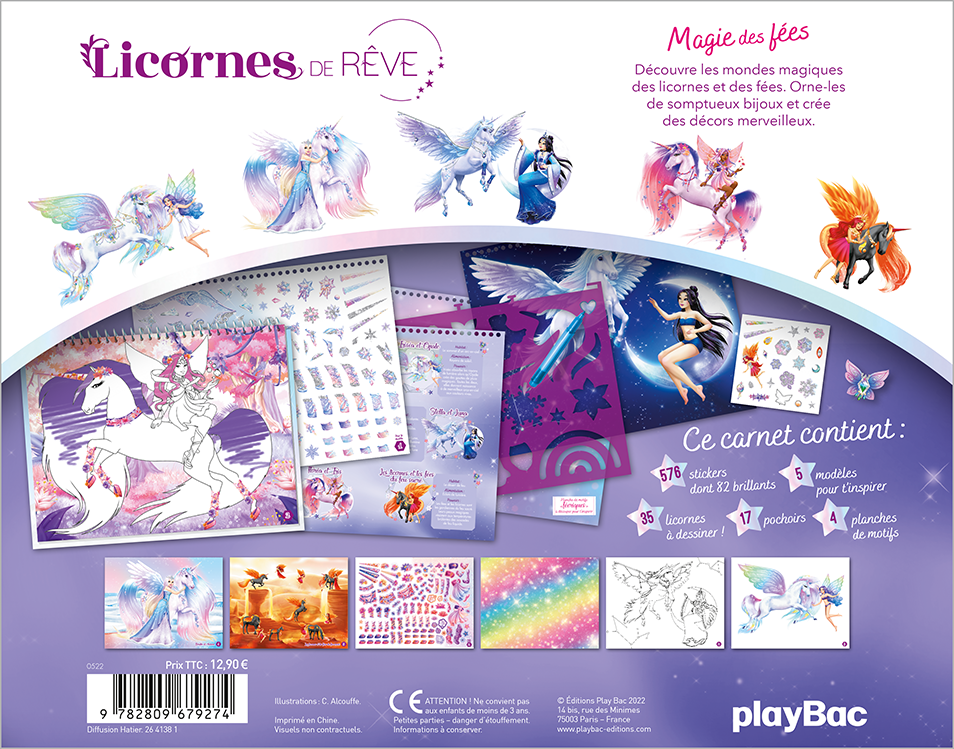 Découvre les mondes magiques des licornes et des fées ! Orne-les de somptueux bijoux et crée des décors merveilleux. Ce carnet contient : – 576 stickers dont 82 brillants ; – 5 modèles pour t’inspirer ; – 35 licornes à dessiner et à parer de bijoux ; – 17 pochoirs ; – 4 planches de motifs à découper. Avec la présentation des licornes et fées et leur carte d’identité.