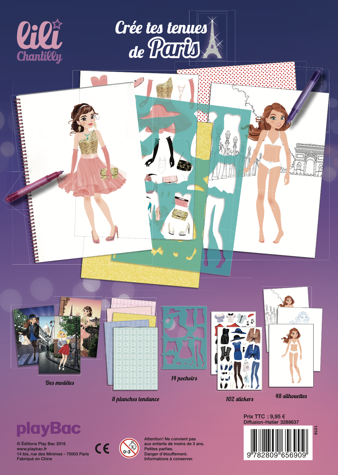 Le carnet de mode 100 % Paris, 100 % glamour ! Petite ou grande styliste, à toi de créer tes tenues Mode Paris dans des décors mythiques de la capitale. Ce carnet contient : – des pages de modèles, inspirés de la haute couture parisienne ; – plus de 100 stickers ; – 14 pochoirs ; – 8 planches de tissus à découper ; – 48 silhouettes à habiller. Dès 6 ans.