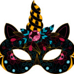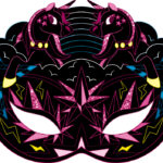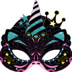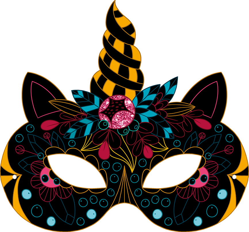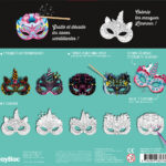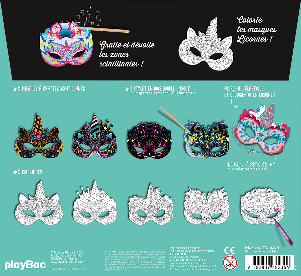 Cette pochette contient : 5 masques à gratter brillants, 5 coloriages, 1 pique en bois pour gratter finement ou plus largement, 5 élastiques pour accrocher tes masques.
