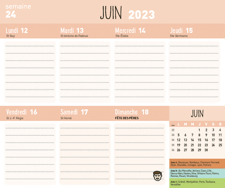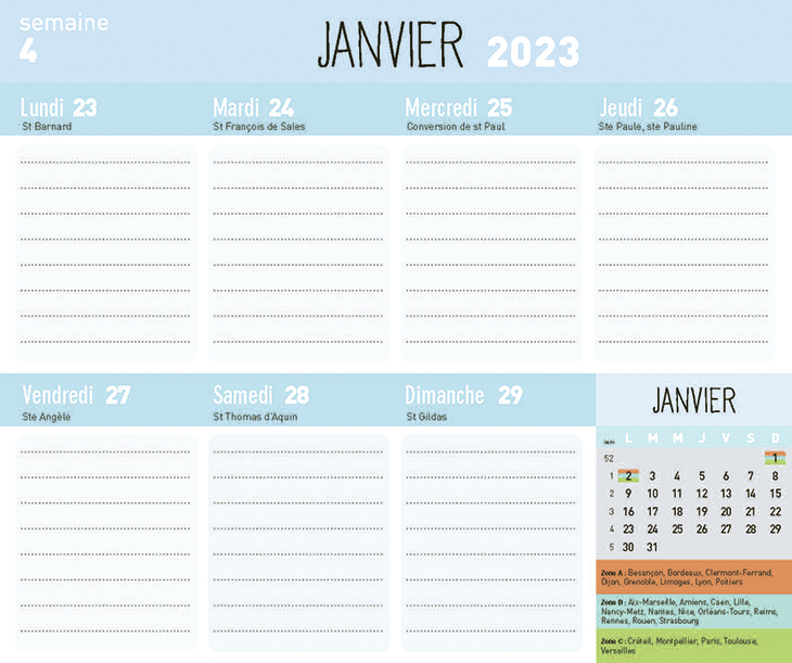 Acheter en vrac, recoudre un vêtement abîmé, fabriquer sa lessive… autant de petites choses qui peuvent amener à de grands changements ! Sans bousculer votre quotidien, découvrez au fil de l’année quelques gestes simples pour agir à votre rythme de façon écoresponsable. Le tout dans un calendrier d’organisation familiale hebdomadaire (de janvier à décembre 2023) pour une vie sans faille ! Fabrication eco-friendly : pas de plastique, encres végétales, crayon de bois, aimant réutilisable.